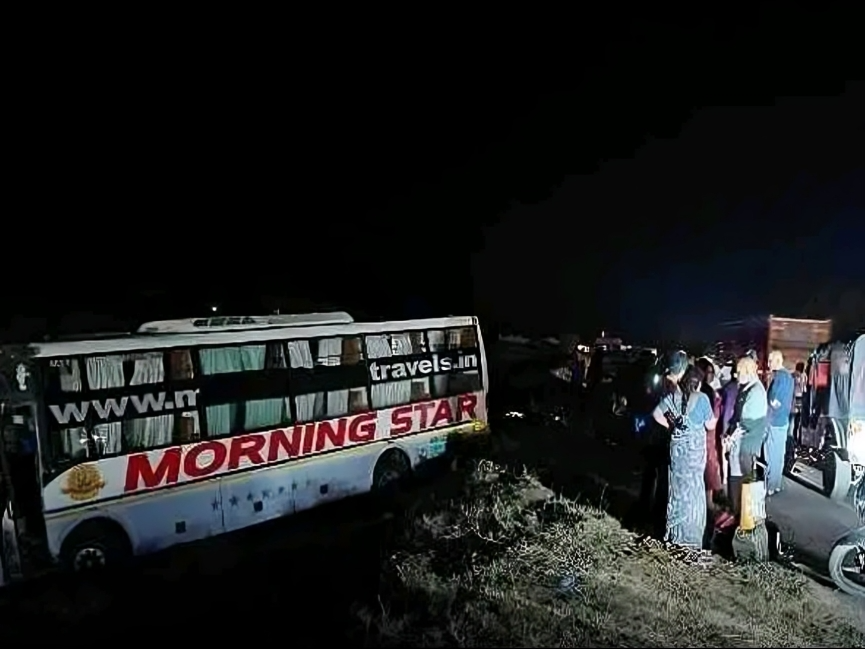 నంద్యాల జిల్లాలో ఇవాళ తెల్లవారుజామున ప్రైవేట్ ట్రావెల్స్ బస్సుకు ప్రమాదం తప్పింది. చాబోలు హైవేపై మార్నింగ్ స్టార్ బస్సు టైరు పేలడంతో అదుపు తప్పి పొలాల్లోకి దూసుకెళ్లింది. ఈ ఘటనలో 10 మంది గాయపడ్డారు. పోలీసులు చేరుకుని వారిని ప్రభుత్వ ఆసుపత్రికి తరలించారు. మిగతా ప్రయాణికులను సురక్షితంగా నంద్యాల ఆర్టీసీ బస్టాండ్కు చేర్చారు.
