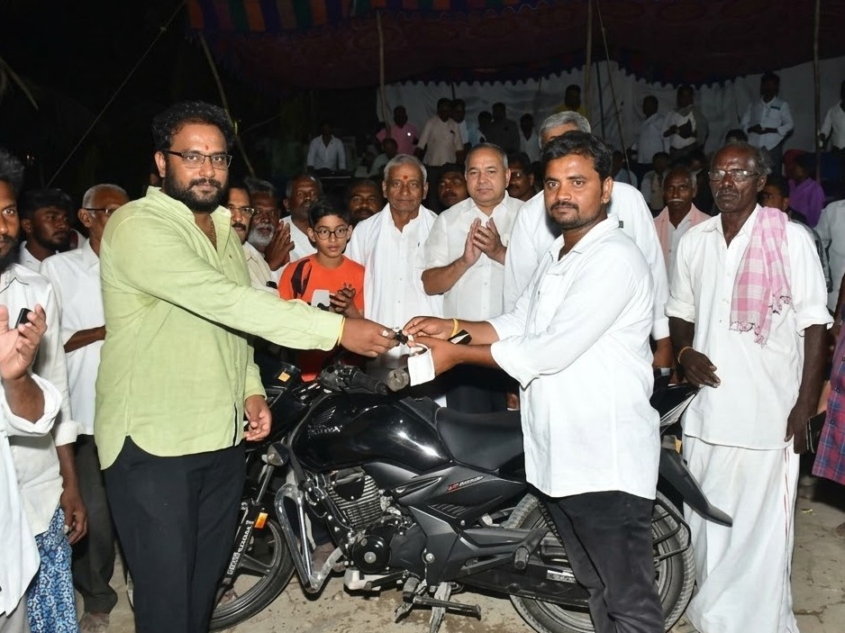 NDL: బనగానపల్లె మండలం నందవరం చౌడేశ్వరి దేవి ఉత్సవాల్లో బండలాగుడు పోటీలు ఉత్సాహంగా జరిగాయి. ప్రొద్దుటూరుకు చెందిన చంద్ర ఓబులరెడ్డి వృషభాలు ప్రథమ స్థానం సాధించి యూనికార్న్ బైక్ గెలుచుకున్నాయి. గన్నవరం ఎడ్లు రూ.లక్ష, సూర్యాపేట ఎడ్లు రూ.80 వేలు, పెద్దకొట్టాల ఎడ్లు రూ.60 వేల బహుమతులు పొందాయి. విజేతలకు ఛైర్మన్లు పీవీ కుమార్ రెడ్డి మంగళవారం బహుమతులు అందజేశారు.