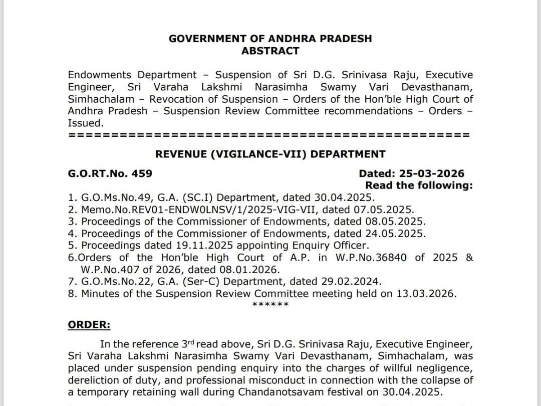 VSP: సింహాచలం దేవస్థానంలో చందనోత్సవంలో గోడ కూలిన పలువురు మరణించిన ఘటనలో సస్పెండ్ అయిన దేవస్థానం ఈఈ శ్రీనివాసరాజుపై ప్రభుత్వం సస్పెన్షన్ను ఎత్తివేసింది. ఈ మేరకు బుధవారం అధికారిక ఉత్తర్వులు జారీ చేసింది. ఘటనపై విచారణ అనంతరం విధించిన క్రమశిక్షణా చర్యలను ఇప్పుడు రద్దు చేయడంతో, ఆయన తిరిగి విధుల్లో చేరనున్నారు.