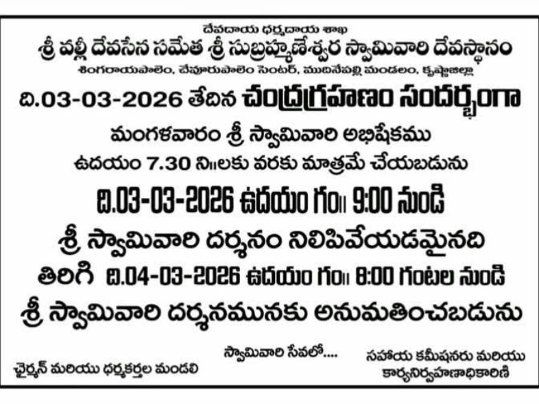 ELR: ముదినేపల్లి మండలం సింగరాయపాలెం చేవూరు పాలెం సెంటర్లోని వేంచేసి ఉన్న శ్రీ వల్లే దేవసేన సమేత సుబ్రహ్మణ్యేశ్వర స్వామి వారి ఆలయాన్ని మంగళవారం మూసి వేస్తున్నట్లు అధికారులు తెలిపారు. ఈ సందర్భంగా ఉదయం 9 గంటల నుంచి శ్రీ స్వామివారి దర్శనాన్ని నిలిపివేసి తిరిగి బుధవారం 8 గంటల నుంచి స్వామివారి దర్శనానికి అనుమతి ఇస్తామన్నారు.