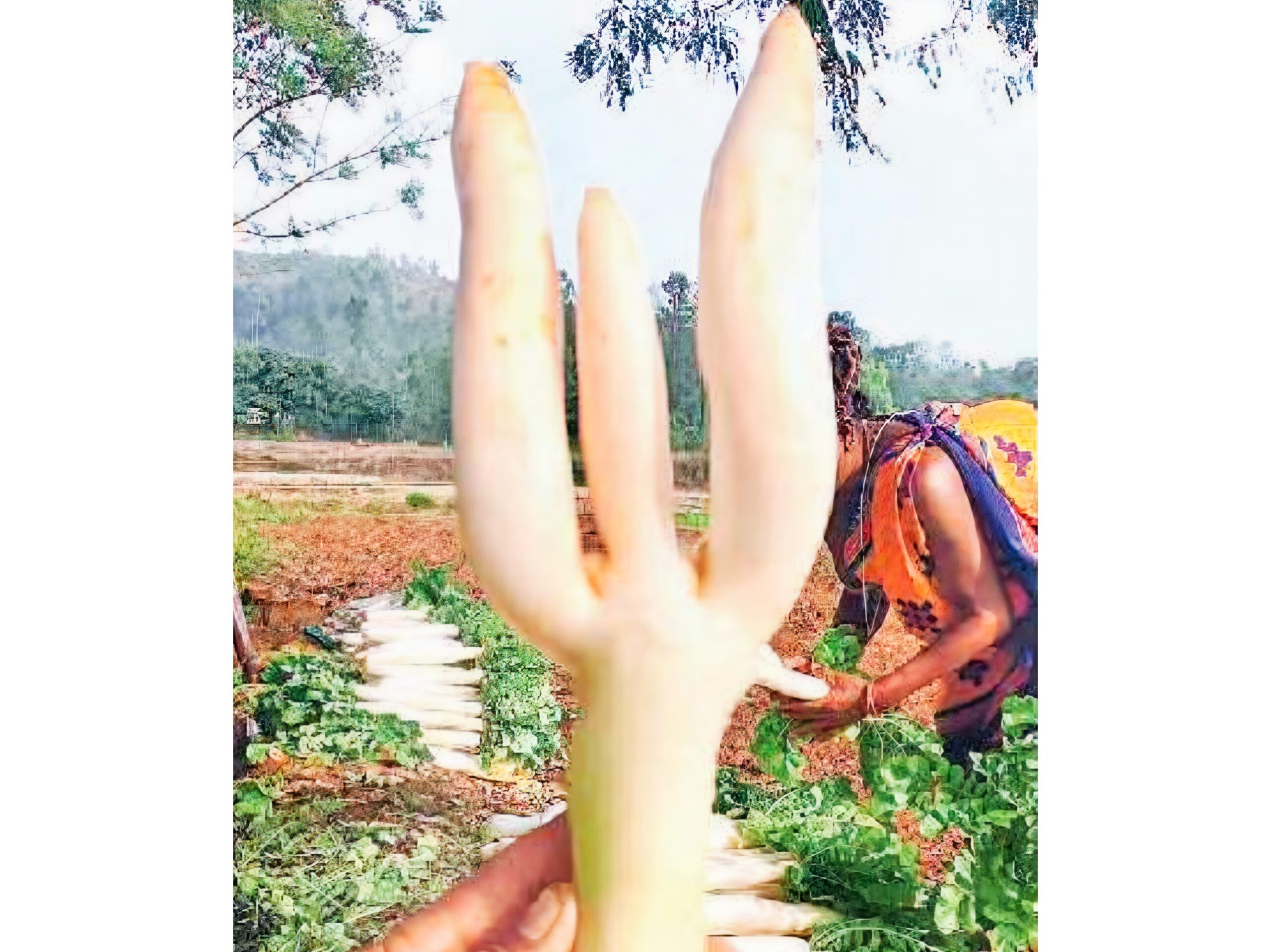 ASR: అరకులోయ మండలం పరిధిలో అరుదైన ఆకారంలో పెరిగిన ముల్లంగి దుంప అందరినీ ఆశ్చర్యానికి గురిచేసింది. మండలంలోని చినలబుడు పంచాయతీ మాలివలస గ్రామానికి చెందిన గిరిజన రైతు జొయో సాగు చేసిన ముల్లంగి తోటలో త్రిశూలం ఆకారంలో దుంప కనిపించింది. ఒకే మొక్కకు మూడు దుంపలు కలసి పెరగడంతో అవి త్రిశూలాన్ని తలపించే విధంగా ఉండటం విశేషంగా మారింది.