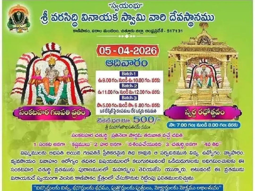 CTR: కాణిపాకం వరసిద్ధి వినాయక స్వామి ఆలయంలో ఈనెల 5న సంకటహర గణపతి వ్రతం నిర్వహిస్తున్నట్లు ఈవో పెంచల కిషోర్ ఓ ప్రకటనలో తెలిపారు. ఉదయం 9గంటలకు, 11 గంటలకు, సాయంత్రం 5గంటలకు మూడు విడతలుగా వ్రతం జరుగుతుందన్నారు. ఆసక్తి ఉన్న భక్తులు రూ.500 టికెట్టు కొనుగోలు చేసి వ్రతంలో పాల్గొనవచ్చని సూచించారు. సాయంత్రం 7 గంటలకు స్వర్ణ రథోత్సవం నిర్వహిస్తామన్నారు.