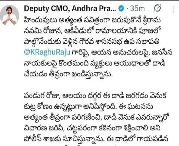 W.G: శ్రీరామనవమి పర్వదినం సందర్భంగా ఆకివీడు రామాలయంలో పూజకు వెళ్లిన డిప్యూటీ స్పీకర్ కనుమూరి రఘురామకృష్ణరాజుపై జరిగిన దాడిని ఉప ముఖ్యమంత్రి పవన్ కళ్యాణ్ ఖండించారు. పవిత్రమైన పండుగ రోజున ఇలాంటి ఘటన జరగడం వెనుక ఏదైనా కుట్ర కోణం దాగి ఉందేమోనని ఆయన అనుమానం వ్యక్తం చేశారు. ఈ ఘర్షణలో గాయపడిన జనసేన పార్టీ నాయకులు వీలైనంత త్వరగా కోలుకోవాలని పవన్ ఆకాంక్షించారు.