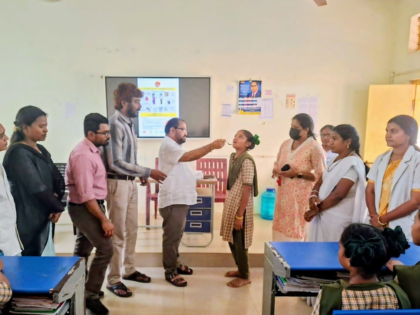 PPM: డీవార్మింగ్ డీవార్మింగ్ మాప్-అప్ డే కార్యక్రమాన్ని జిల్లా వైద్యారోగ్యశాఖ అధికారి డాక్టర్ ఎస్. భాస్కరరావు జోగింపేట, కెజిబివి పాఠశాలలో మంగళవారం ఆర్.బి.ఎస్.కె అధికారి డా టి. జగన్ మోహనరావుతో కలిసి పర్యవేక్షణ చేశారు. జాతీయ నులిపురుగుల నిర్మూలన కార్యక్రమం రోజున ఏవైనా కారణాలచే ఆల్బెండజోల్ మాత్రలు వేయబడని విద్యార్థులు ఎంత మంది ఉన్నారు, అందుకు గల కారణాలు తెలుసుకున్నారు.
