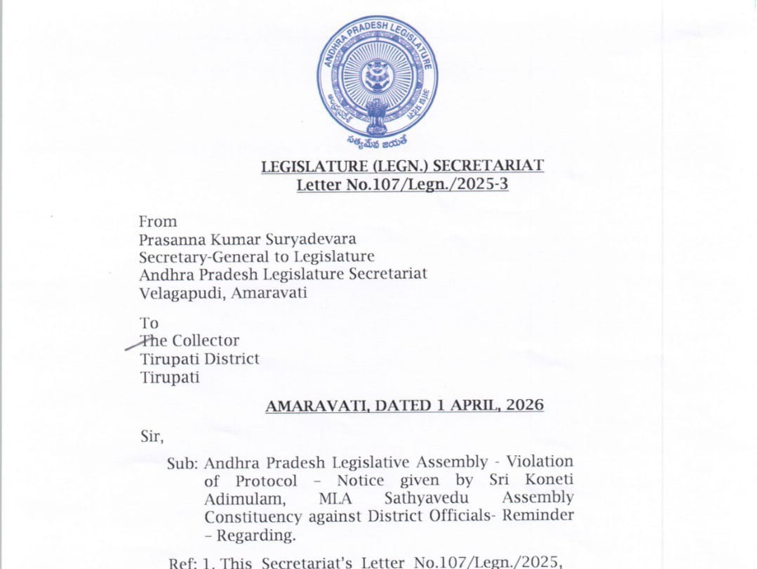 TPT: సత్యవేడు నియోజకవర్గంలో గత కొన్ని నెలలుగా జరుగుతున్న ప్రోటోకాల్ ఉల్లంఘనపై వివరణ కోరుతూ జిల్లా కలెక్టర్ వెంకటేశ్వర్లుకు ఏపీ అసెంబ్లీ సెక్రటరీ జనరల్ ప్రసన్న కుమార్ సూర్యదేవర నోటీసు జారీ చేశారు. జిల్లా, మండల స్థాయి అధికారులు ప్రోటోకాల్ ఉల్లంఘనపై ఈనెల 15వ తేదీ లోపల వివరణ ఇవ్వాలని జిల్లా కలెక్టర్కు నోటీసు ద్వారా తెలిపారు.