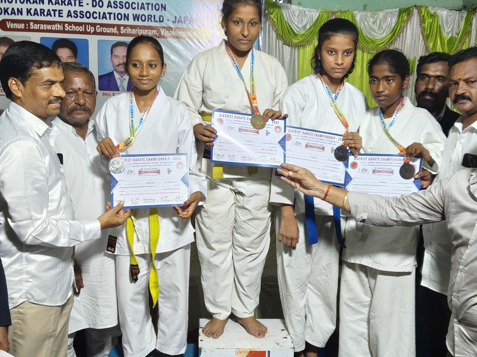 VSP: విశాఖ పశ్చిమ నియోజకవర్గంలోని మల్కాపురం, ఇందిరాకాలనీ మైదానంలో జరిగిన డిస్ట్రిక్ట్ కరాటే ఛాంపియన్షిప్ పోటీలు ఆదివారం ముగిశాయి. ఈ పోటీల్లో విజేతలకు కార్పొరేటర్ పీ.వీ. సురేశ్, వైసీపీ అంగ రామ్ప్రసాద్ చేతుల మీదుగా సర్టిఫికెట్లు, బహుమతులు ప్రదానం చేశారు. ఈ కార్యక్రమంలో నిర్వాహకులు, నాయకులు పాల్గొన్నారు.
