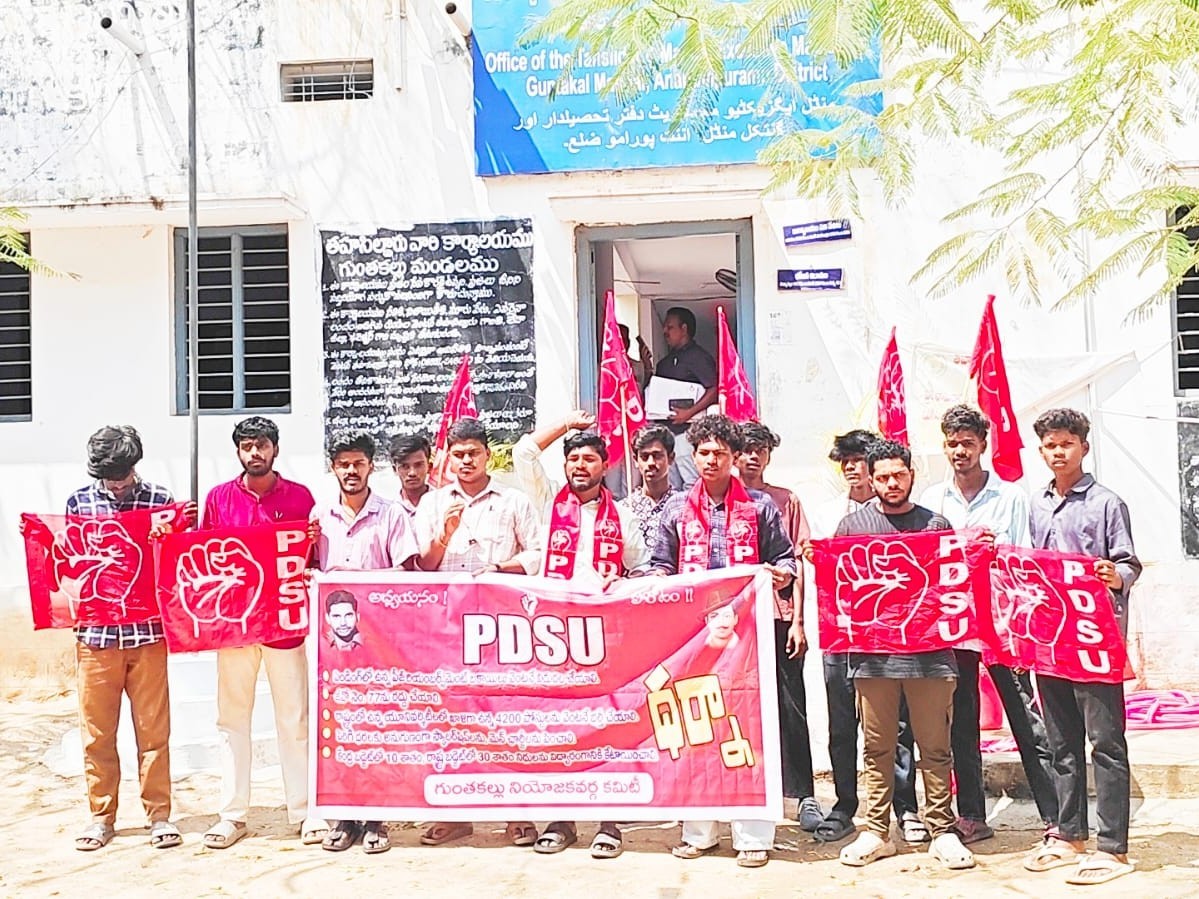 ATP: గుంతకల్లు తహసీల్దార్ కార్యాలయం ఎదుట మంగళవారం PDSU విద్యార్థి సంఘం నాయకులు ధర్నా కార్యక్రమం నిర్వహించారు. కార్యదర్శి వినోద్ మాట్లాడుతూ.. పీజీ విద్యార్థులకు శాపంగా మారినటువంటి జీవో 77ను వెంటనే రద్దు చేయాలని, ప్రభుత్వ యూనివర్సిటీలో 4200 పోస్టును భర్తీ చేయాలని, విద్యారంగానికి 30% నిధులను కేటాయించాలని వారు డిమాండ్ చేశారు.