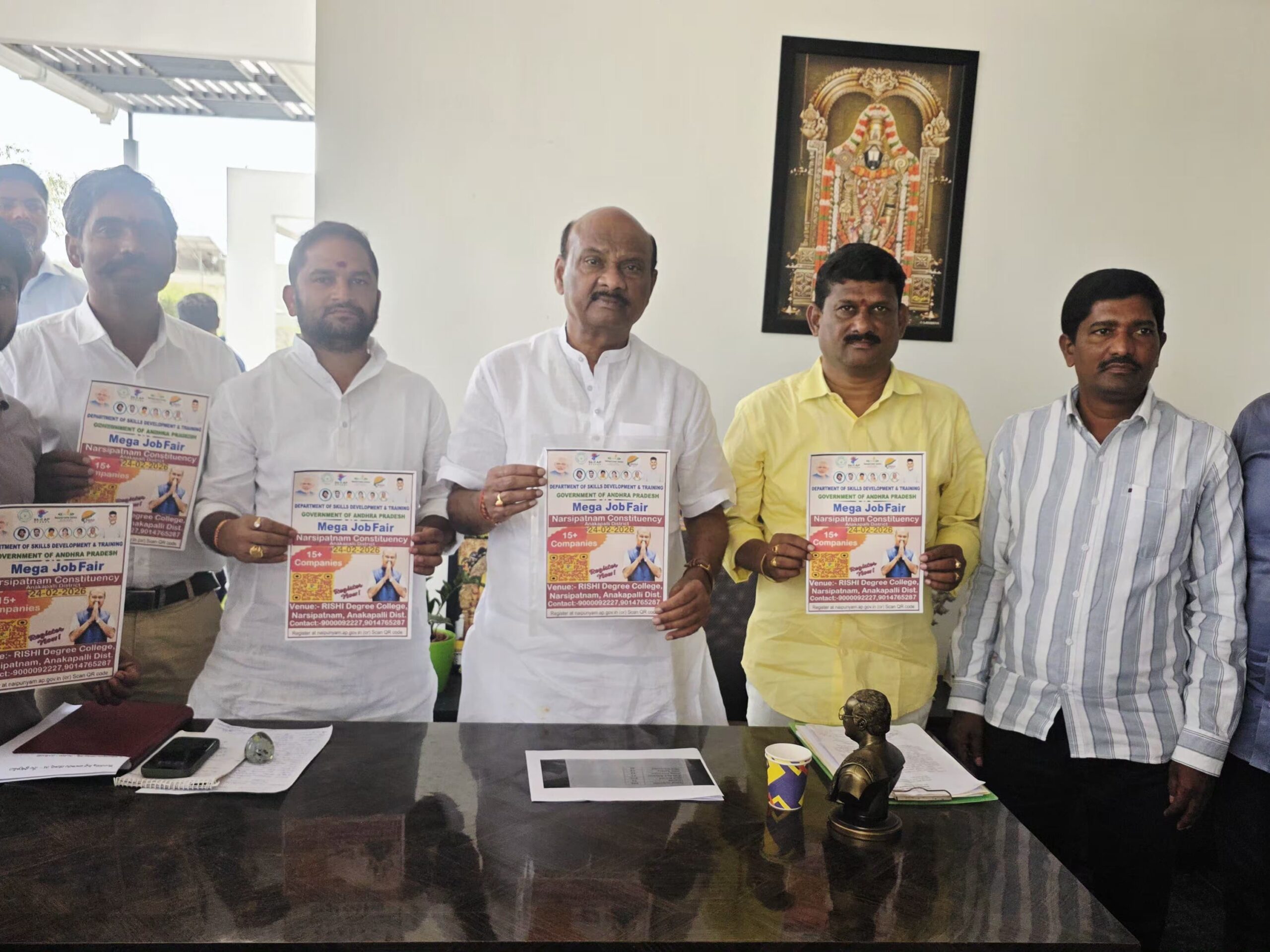 AKP: నర్సీపట్నంలోని రిషి డిగ్రీ కళాశాల వేదికగా ఈ నెల 24వ తేదీన నిర్వహించనున్న మెగా జాబ్ మేళాకు సంబంధించిన పోస్టర్ను స్పీకర్ చింతకాయల అయ్యన్నపాత్రుడు ఆదివారం ఆవిష్కరించారు. రాష్ట్ర నైపుణ్యాభివృద్ధి సంస్థ ఆధ్వర్యంలో జరుగుతున్న ఈ ఉపాధి మేళాలో సుమారు 17 ప్రముఖ కంపెనీలు పాల్గొంటున్నాయని, వీటి ద్వారా 1855 ఉద్యోగ అవకాశాలు కల్పించనున్నట్లు ఆయన వెల్లడించారు.