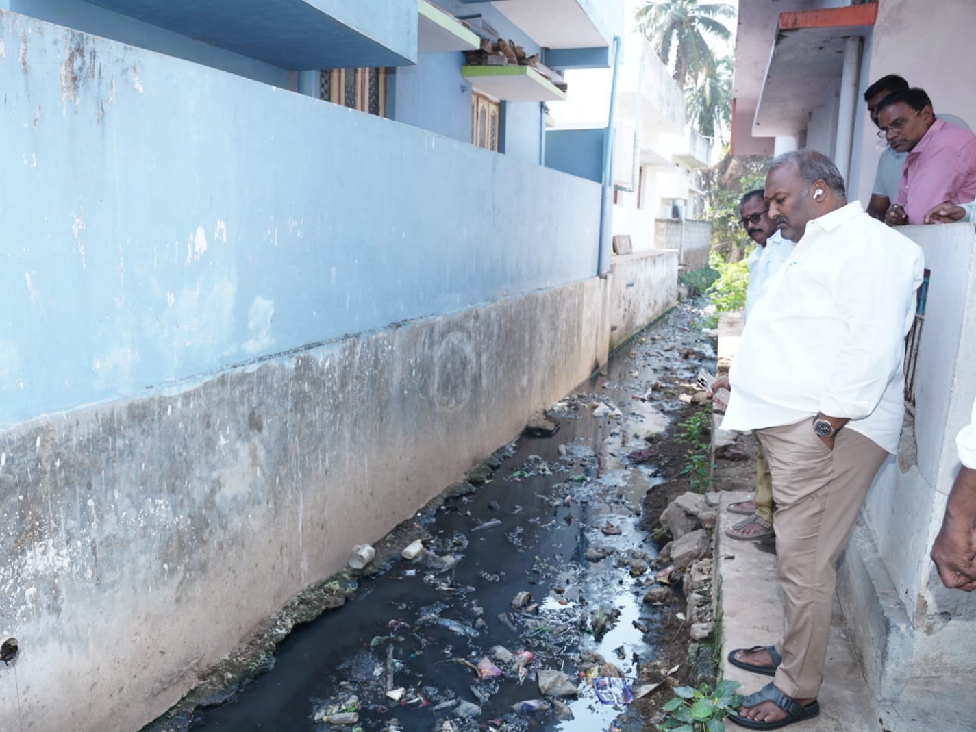 AKP: ఎలమంచిలి పట్టణం ధర్మవరం ప్రాంతంలో శనివారం పర్యటించిన ఎమ్మెల్యే సుందరపు విజయకుమార్ మురికి కాలువలను పరిశీలించారు. తక్షణం కాలువల్లో పూడికతీత పనులు చేపట్టాలని పంచాయతీ కార్యదర్శిని ఆదేశించారు. అనంతరం డ్రైనేజ్ నిర్మాణ పనులను చేపట్టాలన్నారు. డ్రైనేజ్పై అనధికారికంగా ఉంచిన పలకలను తొలగించాలని ఆదేశించారు. గత పాలకులు డ్రైనేజ్ నిర్మాణాన్ని చేపట్టలేకపోయారన్నారు.