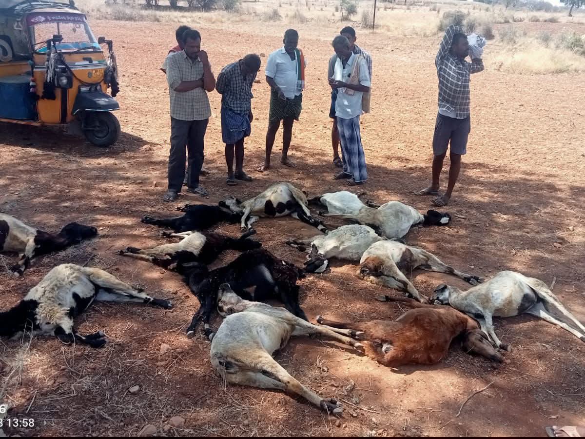 సత్యసాయి: కదిరి మండలం పట్నం గ్రామంలో విషాదం నెలకొంది. పొలం వద్ద పంట కోసం ఉంచిన యూరియా కలిపిన నీరు తాగి 15 గొర్రెలు మృత్యువాత పడ్డాయి. గొర్రెల కాపరి క్రిష్ణ మేతకు తీసుకెళ్లి తిరిగి వస్తుండగా, గొర్రెలు దాహంతో బకెట్లలోని నీటిని తాగాయి. కొద్దిసేపటికే కడుపు ఉబ్బి అవి ప్రాణాలు విడిచాయి. సుమారు లక్షన్నర రూపాయల నష్టం వాటిల్లిందని రైతు వాపోయారు.