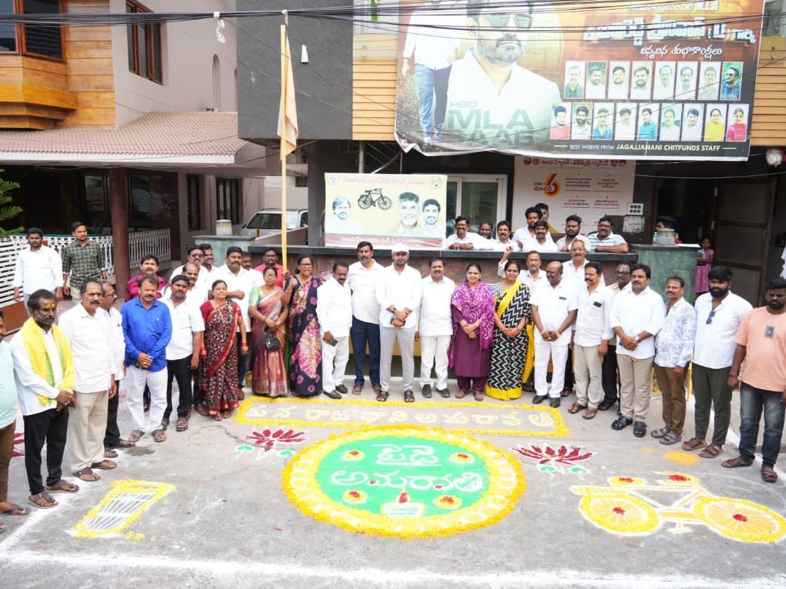 E.G: రాష్ట్ర రాజధానిగా అమరావతికి పార్లమెంట్లో చట్టబద్ధత బిల్లును స్వాగతిస్తూ ఆదివారం రాజమండ్రిలోని నగర టీడీపీ కార్యాలయం వద్ద ‘మన రాజధాని – మన అమరావతి’ అంటూ తెలుగు మహిళలు రంగవల్లులు వేశారు. వాటిని రాజమండ్రి సిటీ ఎమ్మెల్యే ఆదిరెడ్డి శ్రీనివాస్ పార్టీ నాయకులతో కలిసి తిలకించారు. ప్రజా రాజధానికి న్యాయం జరిగిందని హర్షం వ్యక్తం చేశారు.