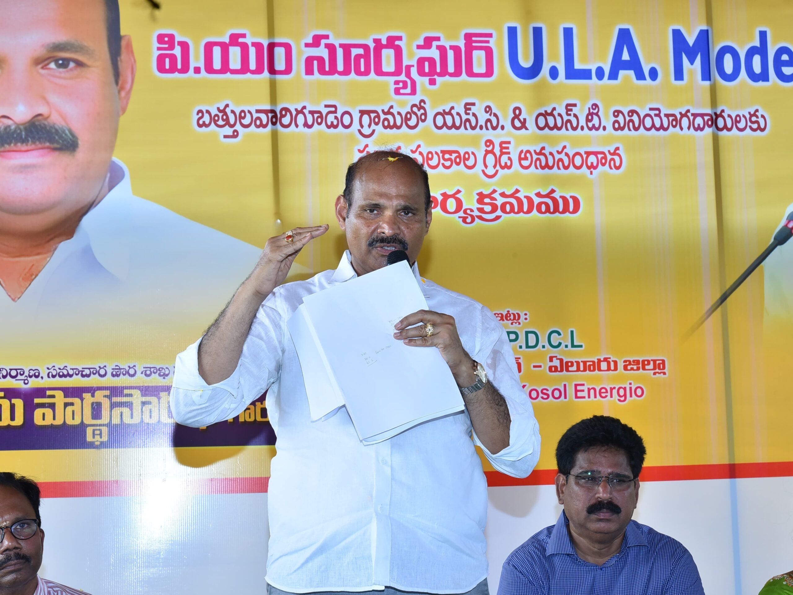 ELR: నూజివీడు మండలం బత్తులవారిగూడెం గ్రామంలో ఆదివారం ఎస్సీ, ఎస్టీ వినియోగదారులకు సూర్య ఫలకాల గ్రిడ్ అనుసంధాన కార్యక్రమంలో రాష్ట్ర గృహనిర్మాణ మంత్రి పార్థసారథి పాల్గొన్నారు. సౌర శక్తిని వినియోగించుకునేందుకు ప్రపంచ దేశాలు పోటీలు పడుతున్నాయని అన్నారు. సోలార్ వినియోగంలో ప్రజలకు విస్తృత అవగాహన కల్పించాలని అధికారులకి సూచించారు.