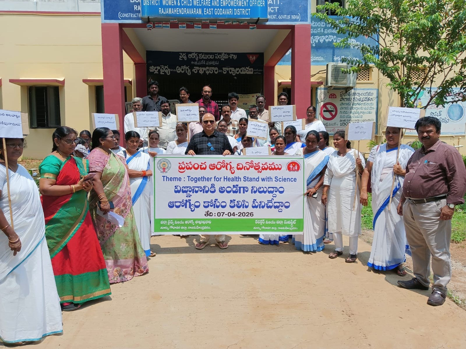 E.G: ప్రపంచ ఆరోగ్య దినోత్సవాన్ని పురస్కరించుకుని తూ.గో జిల్లా వైద్య ఆరోగ్య శాఖ కార్యాలయంలో జిల్లా వైద్య & ఆరోగ్య శాఖ అధికారి డాక్టర్ కె.వెంకటేశ్వరరావు అధ్యక్షతన బుధవారం అవగాహన ర్యాలీ నిర్వహించారు. ప్రపంచ ఆరోగ్య సంస్థ ప్రతి సంవత్సరం ఏప్రిల్ 7న ప్రపంచ ఆరోగ్య దినోత్సవంగా నిర్వహిస్తున్నట్లు తెలిపారు. ప్రజల్లో ఆరోగ్యంపై అవగాహన కల్పిస్తున్నట్లు చెప్పారు.