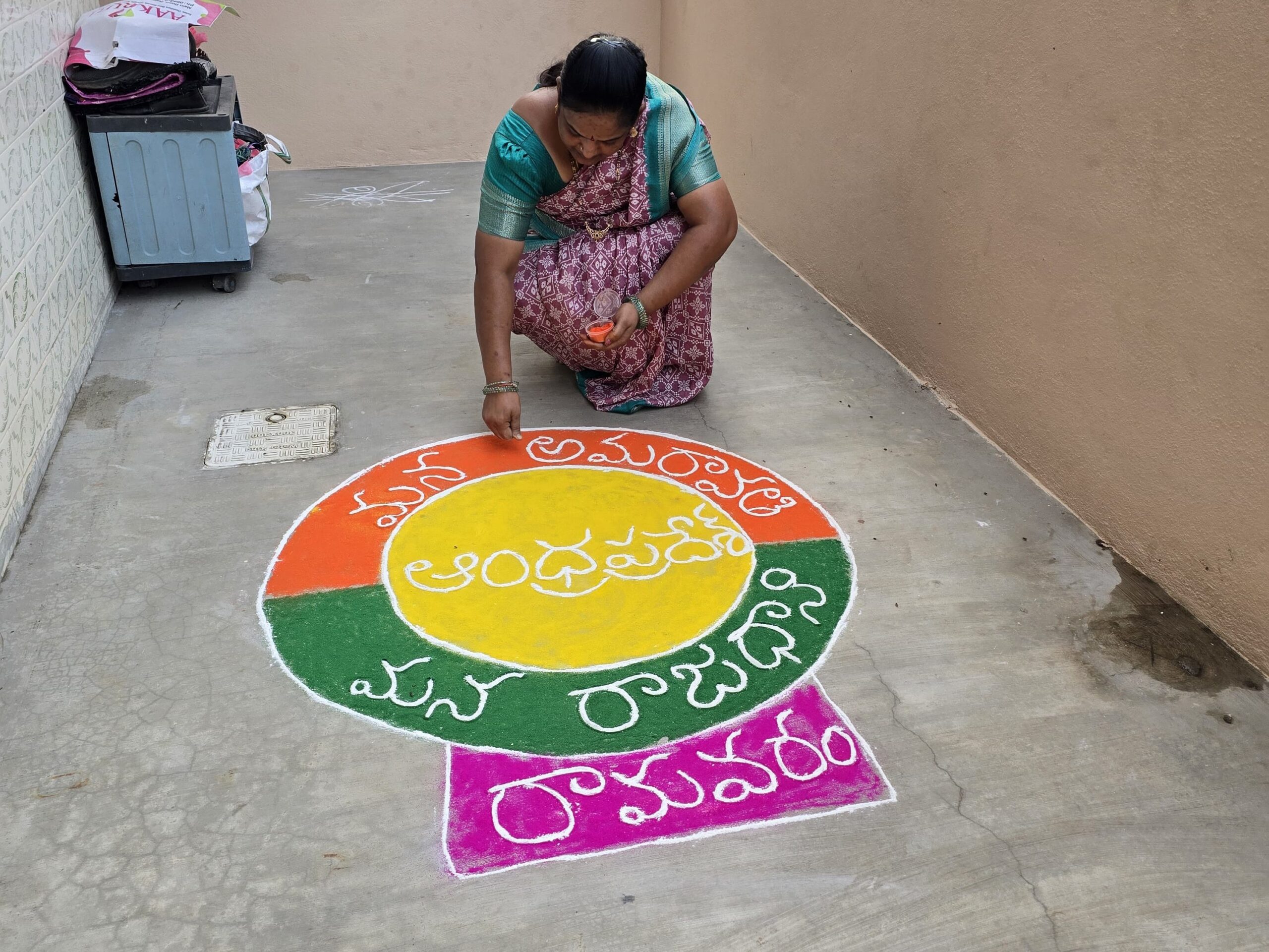 E.G: ప్రతి ఇంటి ముందు సాధారణంగా మహిళలు ముగ్గులు వేస్తారు. ఈ ముగ్గులతో సాంప్రదాయ వాతావరణాన్ని సృష్టించడమే కాకుండా, భారతీయ సంప్రదాయాల పట్ల గౌరవాన్ని తెలియజేస్తుంది. అమరాతి చట్టబద్దత బిల్లుకు పార్లమెంటు ఆమోదం తెలిపిన సందర్భంగా ఆదివారం అనపర్తి నియోజకవర్గం రామవరంలో “మన రాజధాని మన అమరావతి” అంటూ మహిళనె ముగ్గులు వేశారు. ఎంతోమంది ఈ ముగ్గును ఆసక్తిగా తిలకించారు.