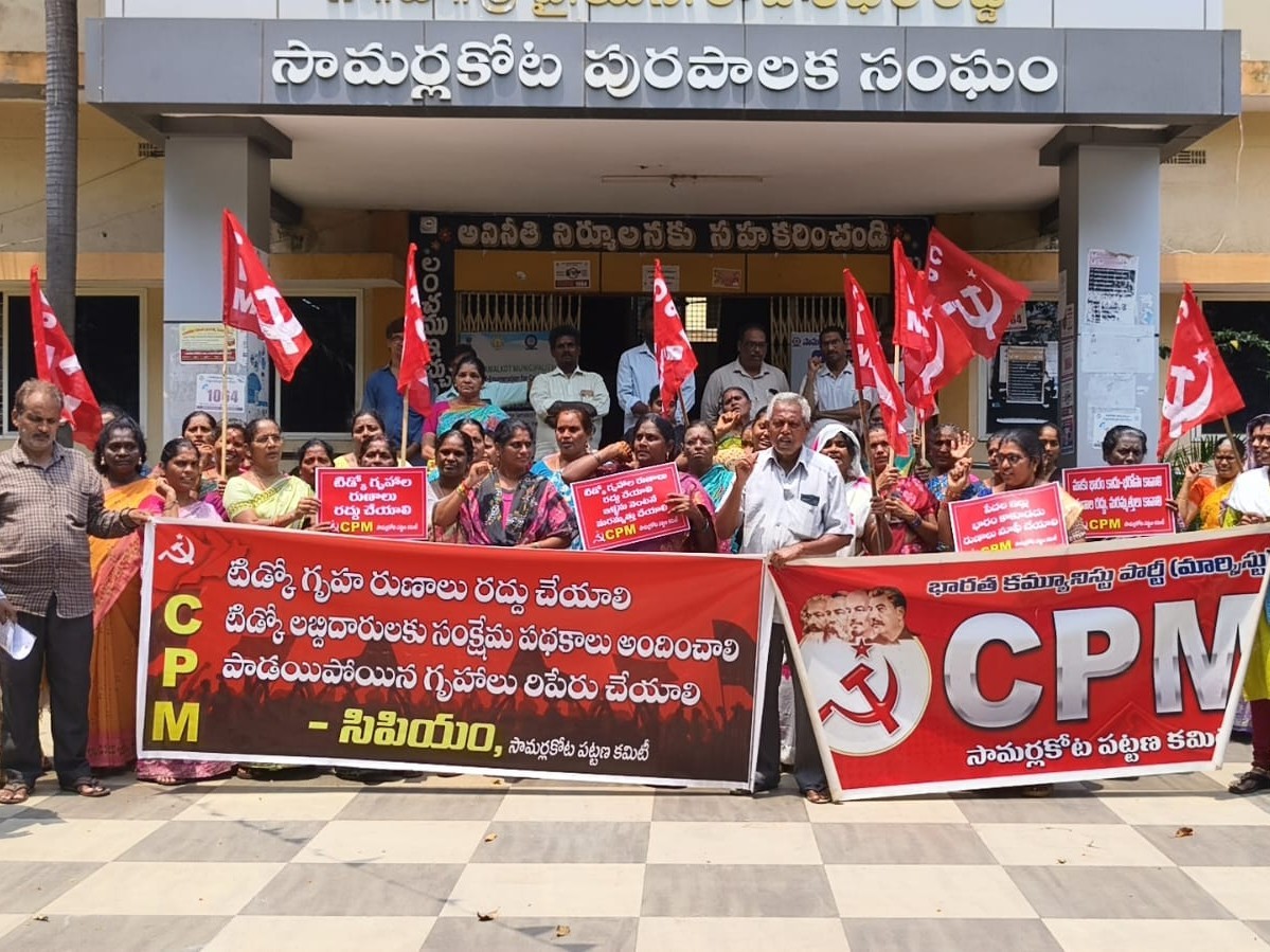కాకినాడ: సామర్లకోట మున్సిపల్ కార్యాలయం వద్ద సీపీఎం ఆధ్వర్యంలో టిడ్కో గృహాల రుణాల రద్దు కోసం ధర్నా నిర్వహించారు. జగ్గమ్మగారి పేటలోని 500 టిడ్కో గృహాల లబ్ధిదారులు రూ. 3.5 లక్షల రుణం పేరుతో నెలకు రూ. 4000 చొప్పున 20 సంవత్సరాలు చెల్లిస్తే రూ. 10 లక్షలు అవుతుందని, ఇది తీవ్ర రుణభారమని సీపీఎం పట్టణ కార్యదర్శి బాలం శ్రీనివాస్ మండిపడ్డారు. చంద్రబాబు తక్షణమే రుణమాపీ చేయాలన్నారు.