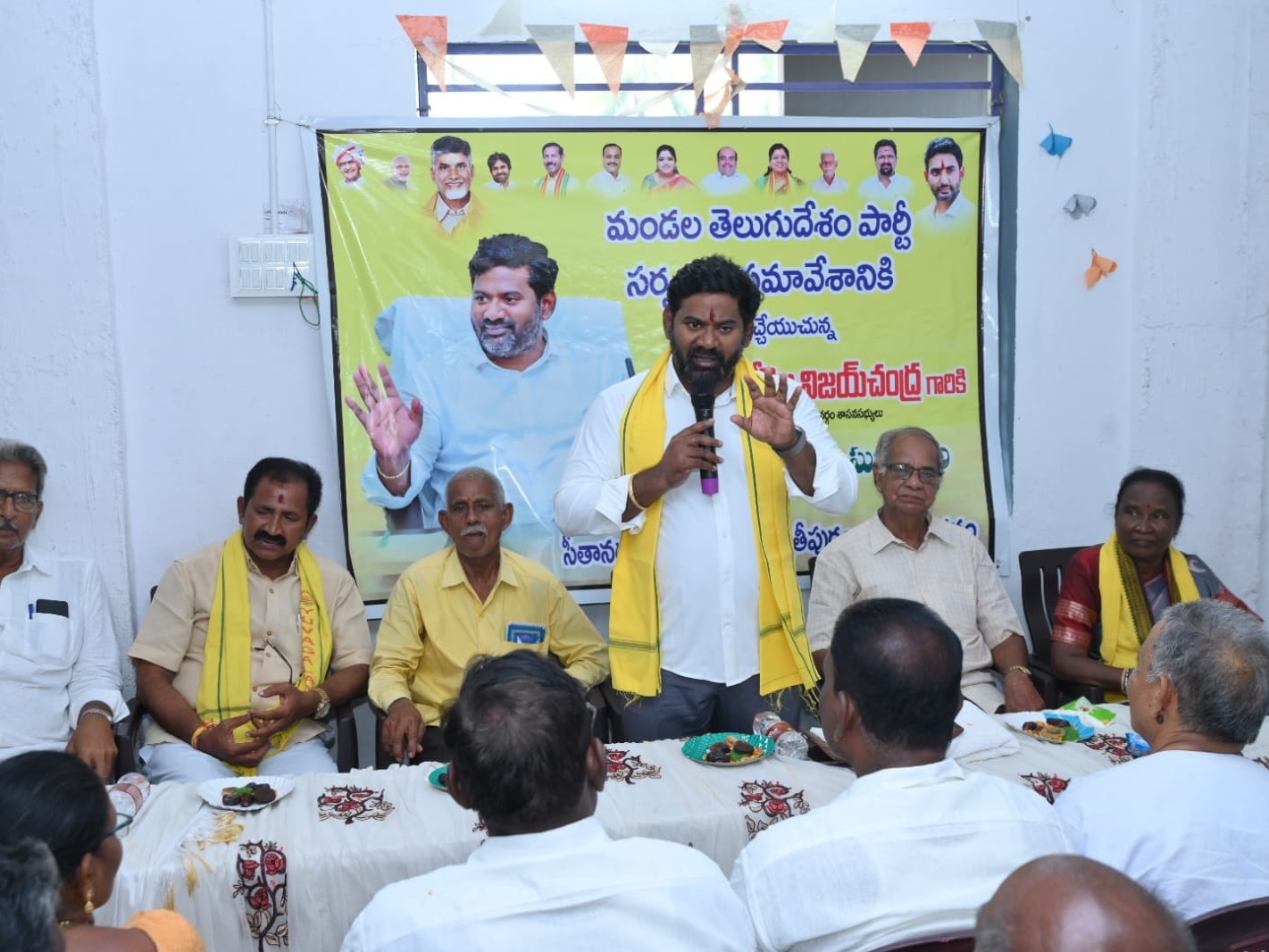 PPM: సీతానగరం మండలంలోని 35 గ్రామపంచాయతీల నాయకులతో స్థానిక మండల కేంద్రంలో గురువారం ఎమ్మెల్యే బోనెల విజయచంద్ర సమీక్ష సమావేశం నిర్వహించారు. ఈ సందర్భంగా ఆయన మాట్లాడుతూ.. టీడీపీని తెలుగు గౌరవం కోసం, తెలుగు వారి ఆత్మ అభిమానం కోసం ఏర్పాటు చేయడం జరిగిందన్నారు. టీడీపీ కోసం నా ప్రాణాలు ఇవ్వడానికైనా సిద్ధమని అన్నారు.