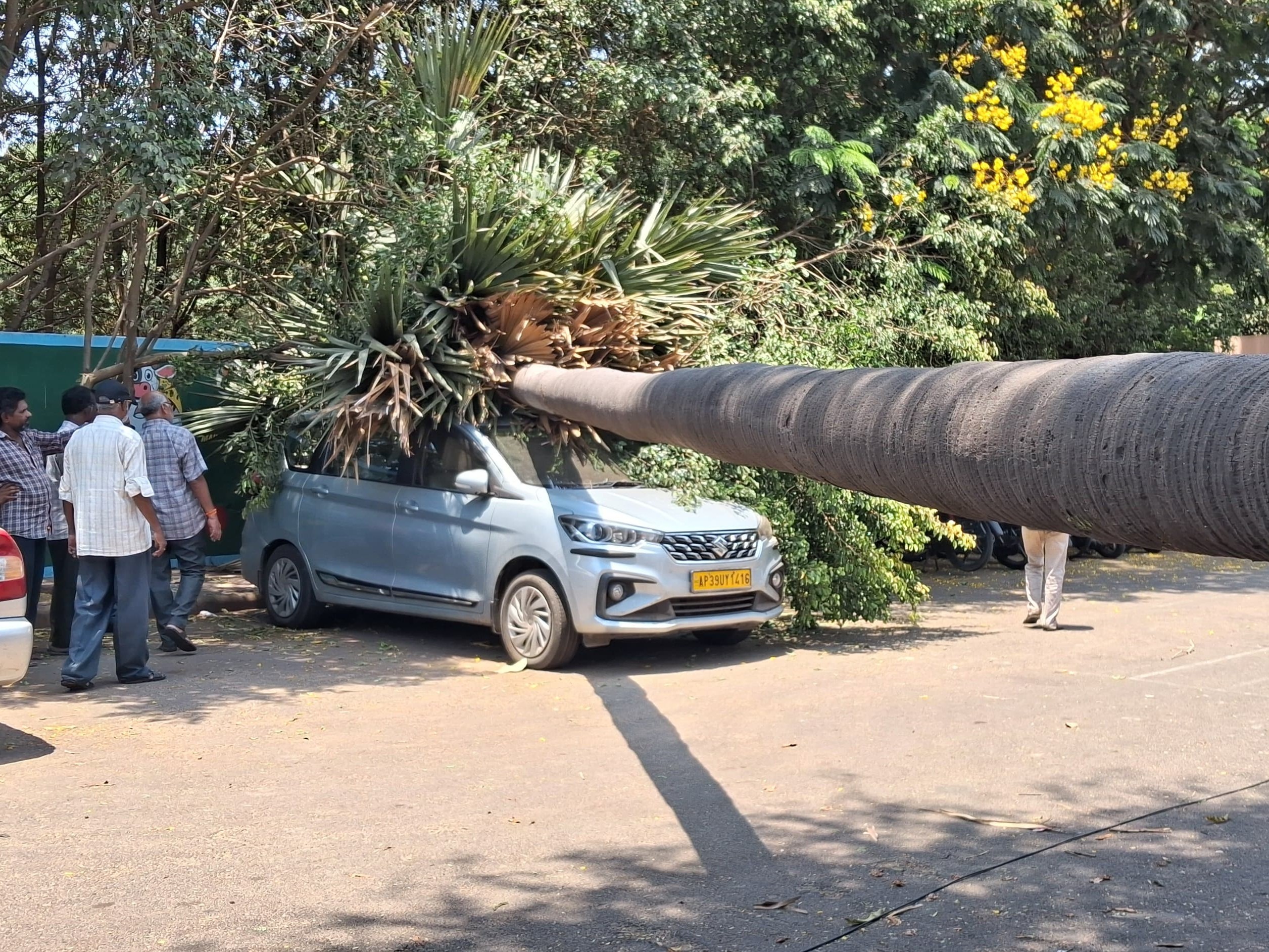 విశాఖలోని శ్రీహరిపురం మార్కెట్ సముదాయం వాకర్స్ జోన్ వద్ద గాలివానకు తాటి చెట్టు నేలకూలింది. చెట్టు ముందు భాగం విరిగి పార్కింగ్లో ఉన్న కారుపై పడటంతో వాహనం స్వల్పంగా దెబ్బతింది. ఈ ఘటన సమయంలో అక్కడ ఎవరూ లేకపోవడంతో పెద్ద ప్రమాదం తప్పింది. వెంటనే స్థానికులు స్పందించి చెట్టును తొలగించారు.