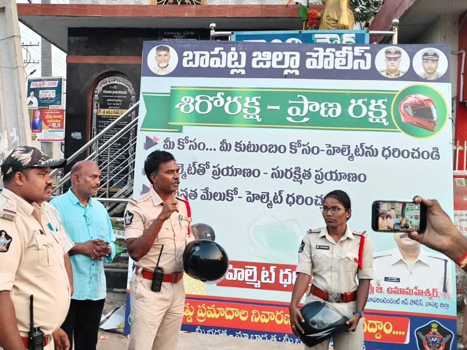 బాపట్ల జిల్లా పోలీసులు రోడ్డు భద్రతపై ప్రత్యేక దృష్టి సారించారు. “శిరో రక్షా–ప్రాణ రక్షా” నినాదంతో హెల్మెట్ వినియోగంపై ప్రచారం నిర్వహిస్తున్నారు. ప్రయాణంలో హెల్మెట్ తప్పనిసరిగా ధరించాలని సూచిస్తున్నారు. చిన్న జాగ్రత్త పెద్ద ప్రమాదాన్ని నివారిస్తుందని, ట్రాఫిక్ నియమాలు పాటించి సురక్షితంగా ఇంటికి చేరుకోవాలని ప్రజలకు అవగాహన కల్పిస్తున్నారు.