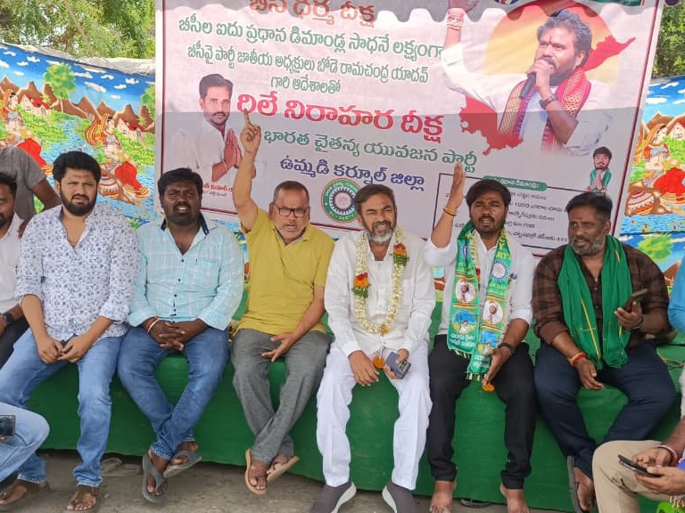 కర్నూలు జిల్లాలో బీసీవై పార్టీ చేపట్టిన బీసీల 5 డిమాండ్లకు బీసీ సంఘాల రాష్ట్ర, జిల్లా నాయకులు గురువారం మద్దతు తెలిపారు. బీసీ రక్షణ చట్టం అమలు, కులగణన, 44% రిజర్వేషన్లు వంటి డిమాండ్లతో రిలే నిరాహార దీక్ష చేపట్టారు. ఏప్రిల్ 11న ఆమరణ దీక్షను విజయవంతం చేయాలని బీసీవై అధినేత రామచంద్ర యాదవ్ పిలుపునిచ్చారు. ఈ కార్యక్రమంలో నేతలు, కార్యకర్తలు పాల్గొన్నారు.