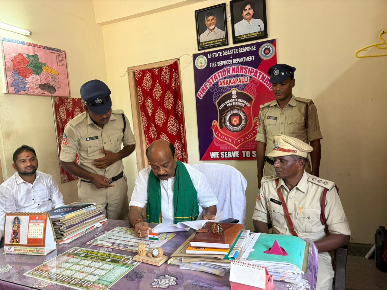 అనకాపల్లి: నర్సీపట్నం ఫైర్ ఆఫీస్ వద్ద గురువారం నూతన అగ్నిమాపక వాహన సకటాన్ని స్పీకర్ చింతకాయల అయ్యన్నపాత్రుడు దంపతులు ప్రారంభించారు. ఈ సందర్భంగా ఆయన మాట్లాడుతూ.. నర్సీపట్నంలో మరో నూతన అగ్నిమాపక వాహనం రావడం సంతోషంగా ఉందన్నారు. 9 మండలాల ప్రజలకు విశిష్ట సేవలు అందుతాయని పేర్కొన్నారు. కార్యక్రమంలో ఫైర్ ఆఫీసర్ అప్పలస్వామి, ఫైర్ సిబ్బంది తదితరులు పాల్గొన్నారు.