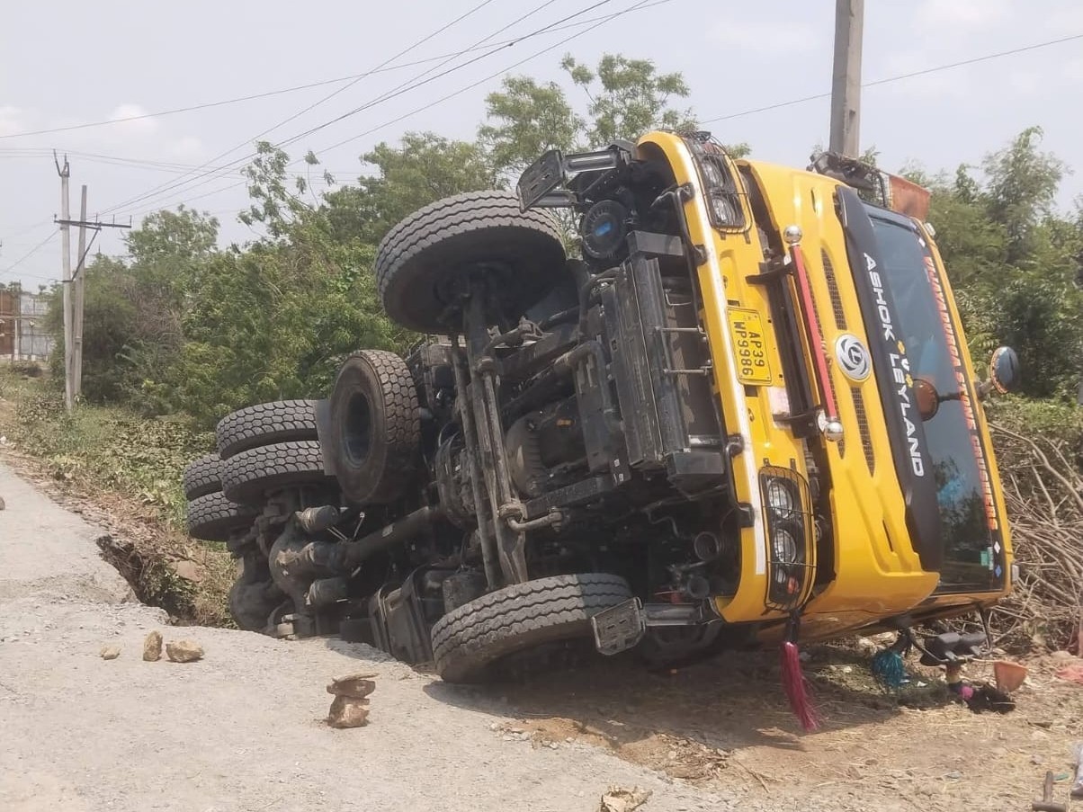 కుంగిన రోడ్డు .. డ్రైన్‌లో టిప్పర్ లారీ