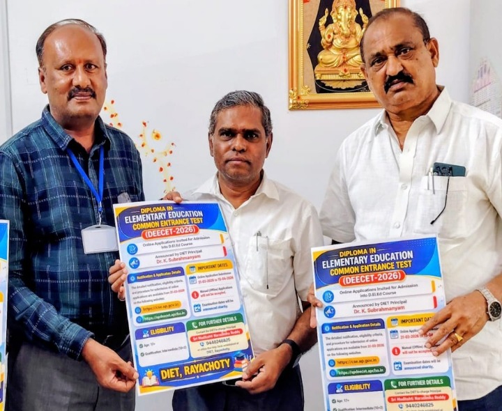 అన్నమయ్య: 2026–27 విద్యా సంవత్సరానికి డి.ఎడ్ కోర్సు ప్రవేశాల కోసం DEECET-2026 నోటిఫికేషన్ విడుదలైంది. అభ్యర్థులు కేవలం ఆన్‌లైన్ ద్వారా మాత్రమే దరఖాస్తు చేసుకోవాలని డైట్ ప్రిన్సిపల్ డా. కె. సుబ్రహ్మణ్యం తెలిపారు. రాయచోటి బాలిక ఉన్నత పాఠశాలలో పోస్టర్లను ఆవిష్కరించారు. దరఖాస్తుల చివరి తేదీ ఏప్రిల్ 15 కాగా, పూర్తి వివరాలు అధికారిక వెబ్‌సైట్లలో అందుబాటులో ఉన్నాయన్నారు.