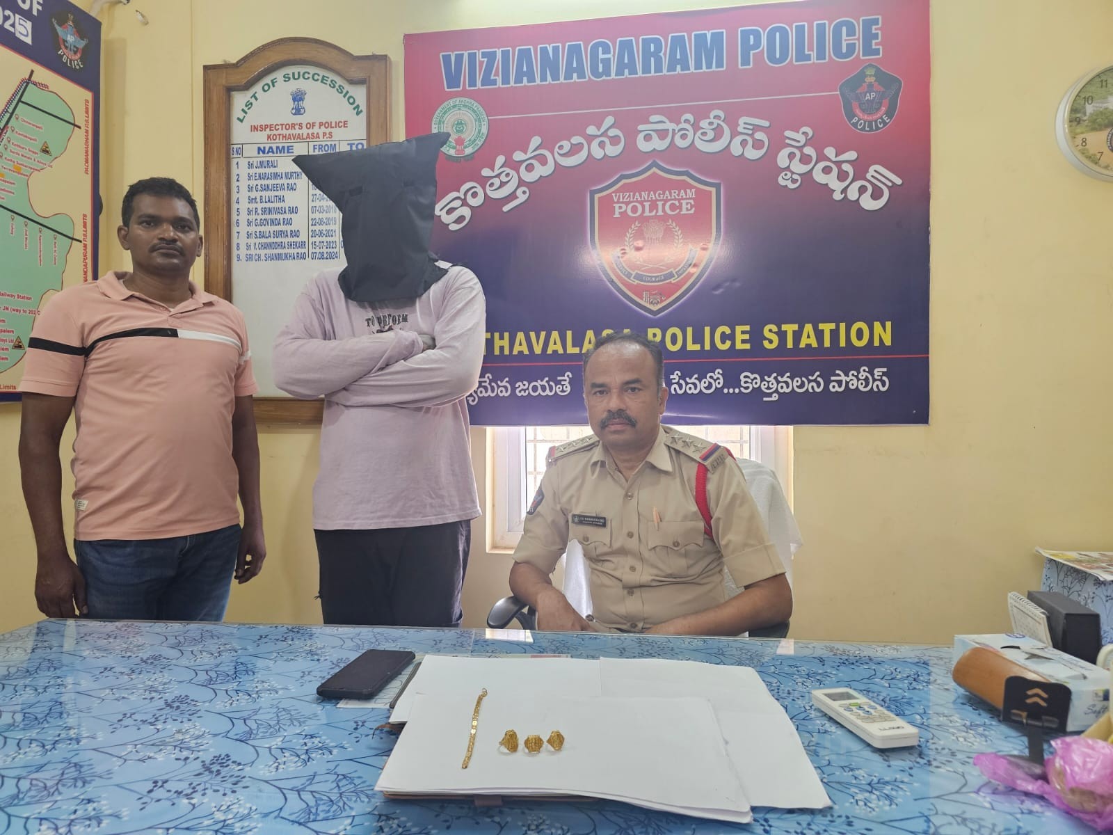 VZM: కొత్తవలస పట్టణ కేంద్రం కుమ్మరివీధిలో శ్రీకాకుళపు శ్రీను ఇంటిలో గత నెలలో ముగ్గురు నిందితులు దొంగతనానికి పాల్పడిన విషయం తెలిసిందే. ఇప్పటికే ఇద్దరిని అరెస్ట్ చేసి రిమాండ్కు తరలించారు.కేసులో మూడో నిందితుడైన సంత మార్కెట్ ఎస్సీ కాలనీ చెందిన కే.నానిని అరెస్ట్ చేసి, అతని వద్ద నుండి మండ చైను, మూడు బంగారు ఉంగరాలను స్వాధీనం చేసుకున్నామని సీఐ షణ్ముఖరావు తెలిపారు.
