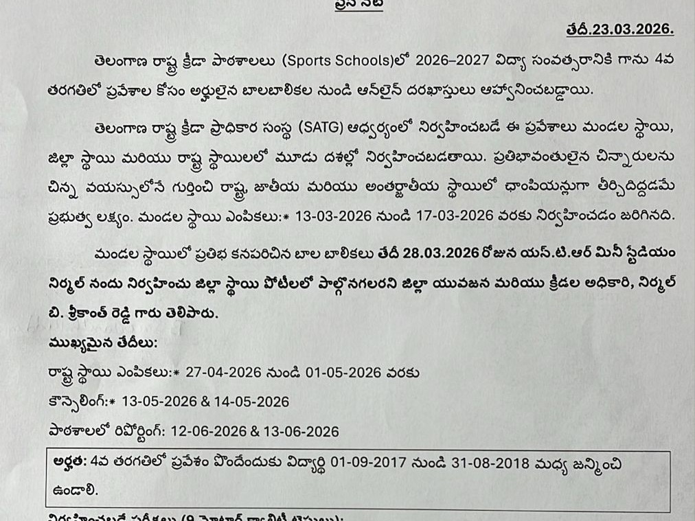 NRML: 2026-27 విద్యా సంవత్సరానికి రాష్ట్ర క్రీడా పాఠశాలల్లో 4వ తరగతి ప్రవేశాలకు దరఖాస్తులను ఆహ్వానిస్తున్నట్లు జిల్లా క్రీడల శాఖ అధికారి సోమవారం తెలిపారు. ఎంపికలు మూడు దశల్లో జరుగుతాయనీ, మండల స్థాయిలో ఎంపికైన విద్యార్థులు మార్చి 28న నిర్మల్లో జి