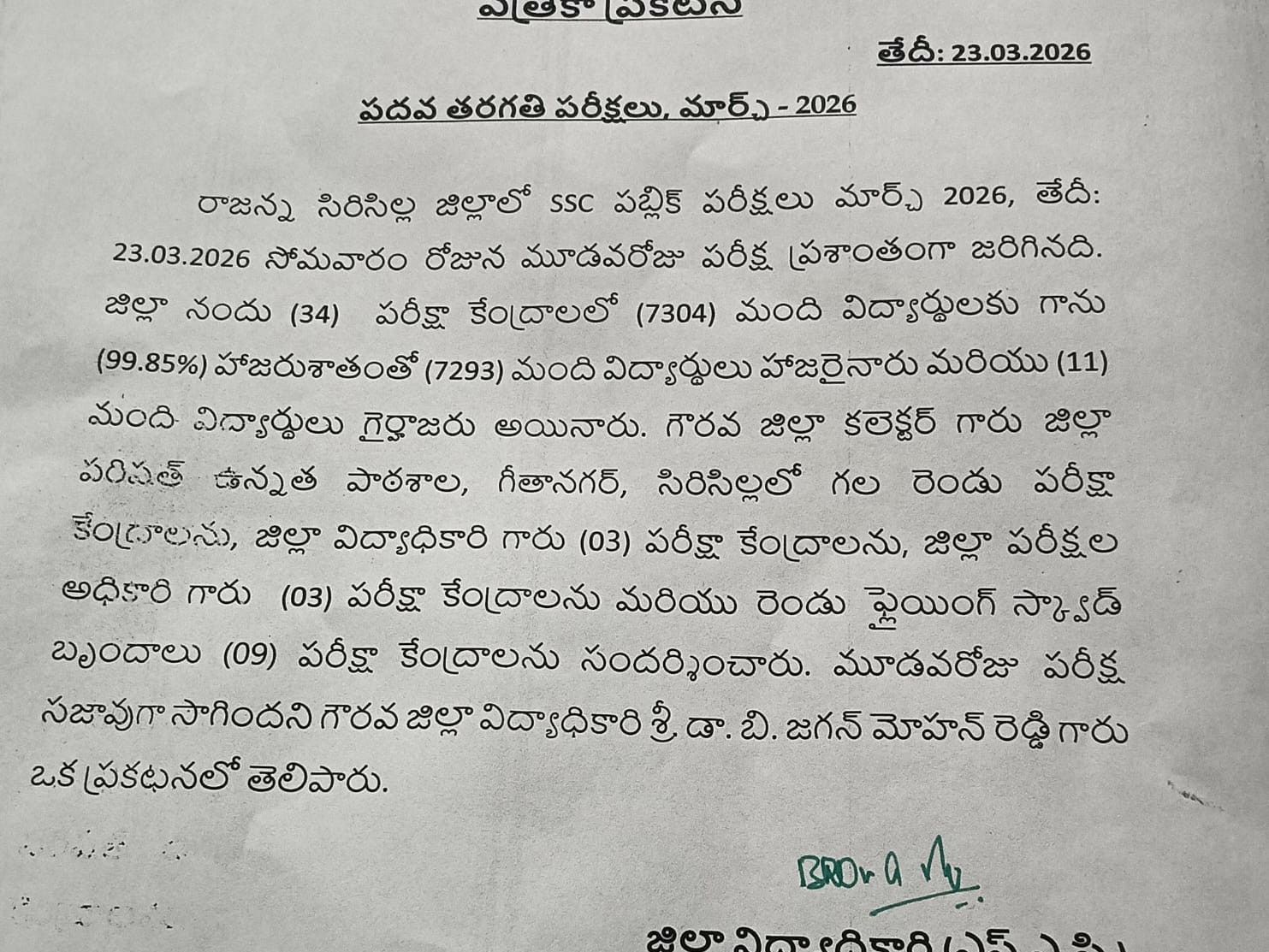 SRCL: సిరిసిల్ల జిల్లాలో SSC పబ్లిక్ పరీక్షలు మూడవ రోజున ప్రశాంతంగా జరిగినట్లు జిల్లా విద్యాధికారి జగన్మోహన్ రెడ్డి ఒక ప్రకటనలో తెలిపారు. 34 పరీక్షా కేంద్రాలలో 7,307 మంది విద్యార్థులకు గాను 7,297 మంది విద్యార్థులు పరీక్షలు రాశారని పేర్కన్నారు. మొత్త