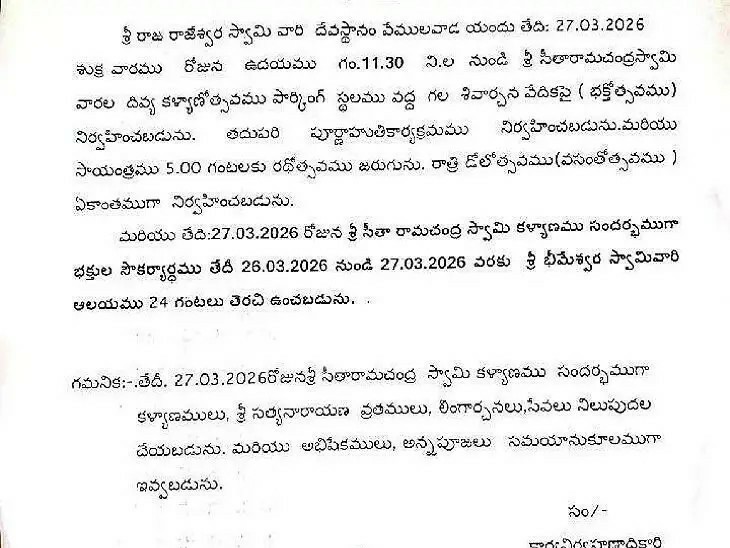 SRCL: రామనవమి నేపథ్యంలో వేములవాడ భీమేశ్వర స్వామి ఆలయాన్ని 26వ తేదీ రాత్రి నుంచి 27వ తేదీ శుక్రవారం రాత్రి వరకు నిరంతరం తెరిచి ఉంచనున్నారు. సీతారాముల కళ్యాణం ఉత్సవానికి వేలాది మంది భక్తులు తరలివచ్చే భక్తులు స్వామివారిని దర్శించుకోవడానికి వీలుగ