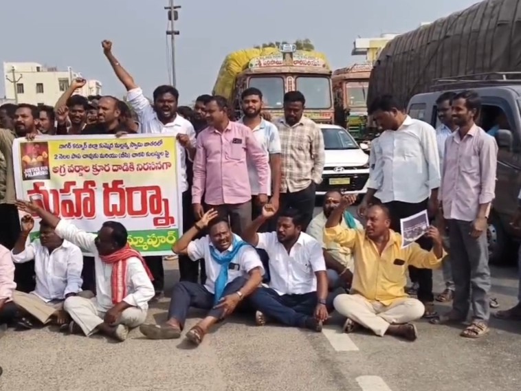 KNR: నాగర్కర్నూల్ జిల్లా కుమ్మెర మల్లన్న స్వామి జాతరలో రెండు నెలల పాప మృతికి కారణమైన వారిపై వెంటనే చర్యలు తీసుకుని కఠినంగా శిక్షించాలని డిమాండ్ చేస్తూ కరీంనగర్ జిల్లా తిమ్మాపూర్ స్టేజ్ వద్ద రజక సంఘం ఆధ్వర్యంలో ధర్నా, రాస్తారోకో నిర్వహించా