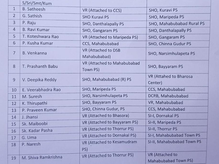 MHBD: జిల్లాలో శాంతిభద్రతల బలోపేతమే లక్ష్యంగా SP డా. శబరీష్ కీలక నిర్ణయం తీసుకున్నట్లు తెలుస్తోంది. జిల్లా వ్యాప్తంగా మొత్తం 19 మంది ఎస్ఐలను బదిలీ చేస్తూ ఉత్తర్వులు జారీచేశారు. కురవి, మరిపెడ, బయ్యారం వంటి కీలక స్టేషన్లకు కొత్త అధికారులను నియమించగ