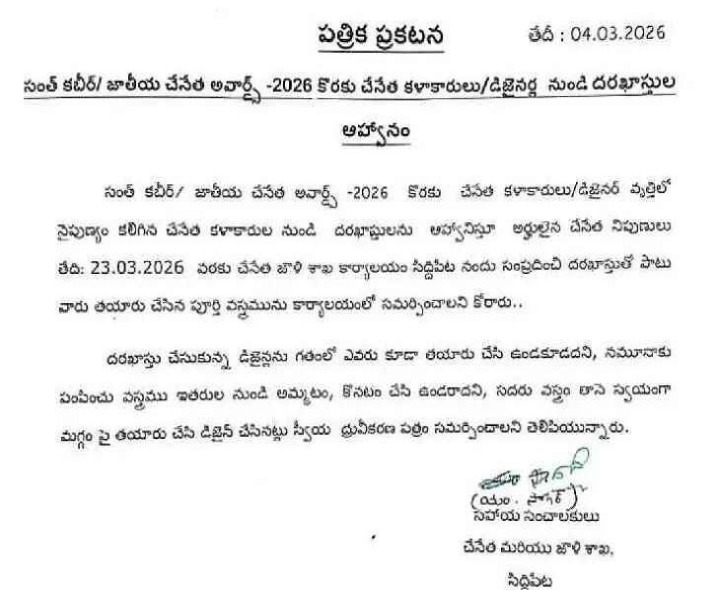 SDPT: జాతీయ చేనేత అవార్డ్స్-2026 కొరకు చేనేత కళాకారులు, డిజైనర్ వృత్తిలో నైపుణ్యం కలిగిన కళాకారుల నుంచి దరఖాస్తులు ఆహ్వానిస్తున్నట్టు చేనేత, జౌళి శాఖ సహాయ సంచాలకులు ఎం.సాగర్ పేర్కొన్నారు. అర్హులైన చేనేత నిపుణులు ఈనెల 23 వరకు సిద్ధిపేట చేనేత జౌళి శా