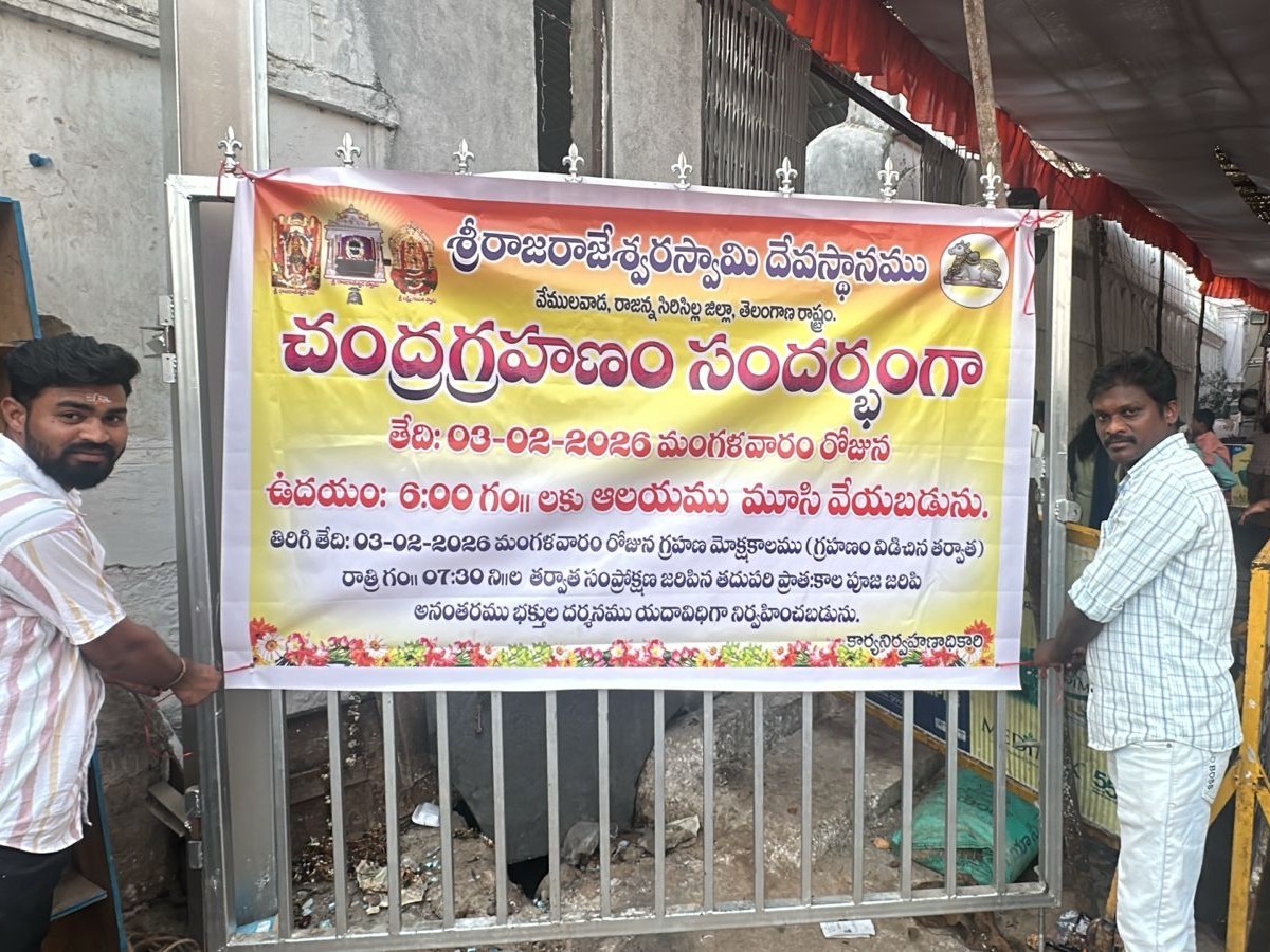 SRCL: చంద్రగ్రహణం సందర్భంగా మంగళవారం ఉదయం 6.15 గంటల నుంచి రాత్రి 7.15 గంటల వరకు వేములవాడలోని శ్రీ రాజరాజేశ్వరస్వామితో పాటు, భీమేశ్వర స్వామి ఆలయం, అనుబంధ ఆలయాలను మూసివేస్తున్నట్లు ఆలయ ఈవో రమాదేవి ఒక ప్రకటనలో తెలిపారు. గ్రహణం ముగిసిన అనంతరం సాయంత్రం 7.