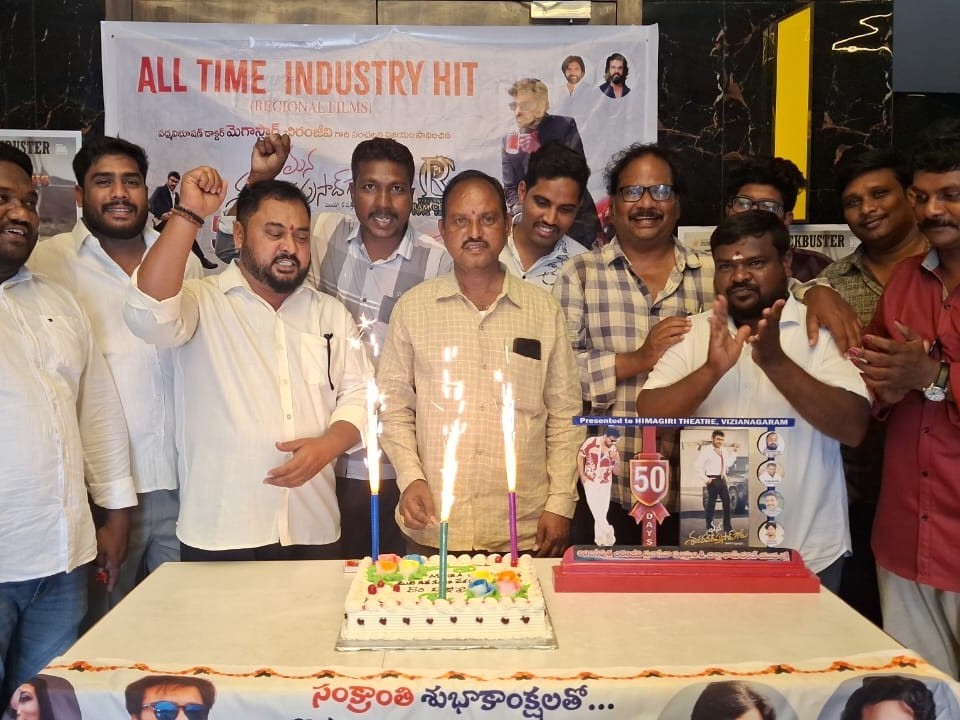 VZM: మన శంకర వరప్రసాద్ సినిమా 50 రోజుల విజయోత్సవ వేడుకలను నగరంలోని హిమగిరి థియేటర్లో సోమవారం ఘనంగా నిర్వహించారు. జిల్లా చిరంజీవి యువత ఆధ్వర్యంలో ఈ వేడుకలు ఘనంగా జరిగాయి. మెగా సెలబ్రేషన్స్లో ముందుగా కేక్ కట్ చేసి, స్వీట్స్ పంచిపెట్టి సంబరాలు జ