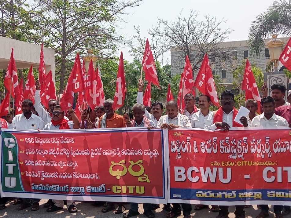 HNK: భవన నిర్మాణ కార్మికుల సమస్యలను పరిష్కరించాలని కోరుతూ సీఐటీయూ ఆధ్వర్యంలో హనుమకొండ కలెక్టరేట్ ఎదుట ధర్నా నిర్వహించారు. కన్స్ట్రక్షన్ వర్కర్స్ ఫెడరేషన్ ఆఫ్ ఇండియా రాష్ట్ర ఉపాధ్యక్షులు ఉప్పలయ్య హాజరై మాట్లాడుతూ.. CSC టెస్టులను రద్దు చేయ