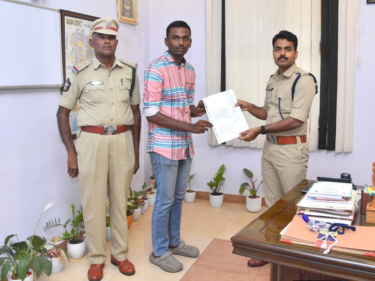 కడపలో అనారోగ్యంతో మృతిచెందిన హోమ్ గార్డు ఎం. రమణమూర్తి కుమారుడు ఎం. అభిషేక్కు కారుణ్య నియామకం కింద హోమ్ గార్డు ఉద్యోగ నియామక పత్రాన్ని జిల్లా ఎస్పీ షెల్కే నచికేత్ విశ్వనాథ్ అందజేశారు. జిల్లా పోలీస్ కార్యాలయంలో జరిగిన కార్యక్రమంలో కుటుంబ సభ్యులను పరామర్శించి, పోలీస్ శాఖ అండగా ఉంటుందని ఎస్పీ తెలిపారు.