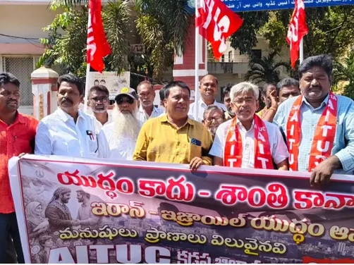 KDP: ఇరాన్-ఇజ్రాయిల్ మధ్య జరుగుతున్న యుద్ధాన్ని తక్షణమే ఆపాలని డిమాండ్ చేస్తూ కడప RDO కార్యాలయం వద్ద AITUC ఆధ్వర్యంలో నిరసన జరిగింది. అమెరికా,ఇజ్రాయిల్ దాడుల వల్ల అమాయకులు ప్రాణాలు కోల్పోతున్నారని ఆవేదన వ్యక్తం చేశారు. యుద్ధం వల్ల ఆర్థిక వ్యవస్థకు ముప్పు వాటిల్లుతుందన్నారు. దౌత్య మార్గాల ద్వారా శాంతి నెలకొల్పాలని డిమాండ్ చేశారు.