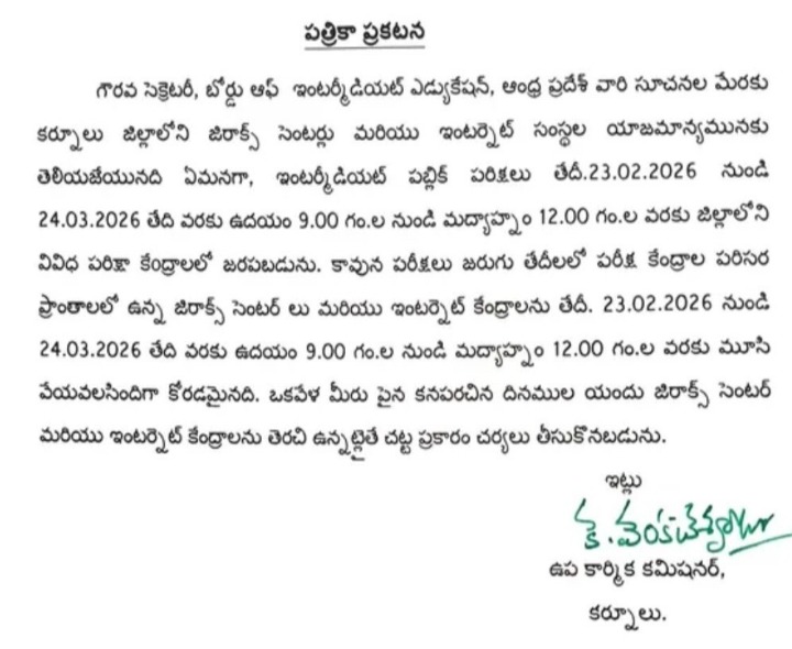 KRNL: జిల్లాలో ఇంటర్మీడియట్ పబ్లిక్ పరీక్షల నేపథ్యంలో బోర్డ్ ఆఫ్ ఇంటర్మీడియట్ ఎడ్యుకేషన్ సూచనల మేరకు జిరాక్స్, ఇంటర్నెట్ కేంద్రాలను మూసివేయాలని ఉప కార్మిక కమిషనర్ కె. వెంకటేశ్వర్లు ఆదేశించారు. ఈనెల 23 నుంచి మార్చి 24 వరకు ప్రతిరోజూ ఉదయం 9 నుంచి మధ్యాహ్నం 12 గంటల వరకు నిబంధనలు ఉల్లంఘిస్తే చట్టపరమైన చర్యలు తీసుకుంటామని హెచ్చరించారు.