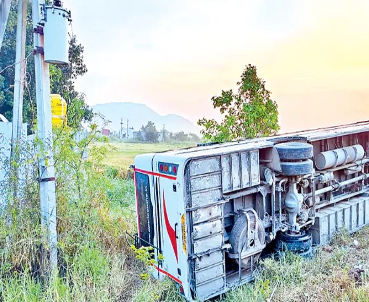 NLR: జిల్లాలో ఆదివారం తెల్లవారుజామున రోడ్డు ప్రమాదం చోటుచేసుకుంది. సంగం మండలం కోలగట్ల సమీపంలో ఆర్టీసీ బస్సు బోల్తా పడటంతో ప్రయాణికులు తీవ్ర భయాందోళనకు గురయ్యారు. అనంతపురం డిపోకు చెందిన ఈ బస్సు నెల్లూరు వైపు ప్రయాణిస్తుండగా, ఎదురుగా వస్తున్న ఒక లారీని తప్పించబోయి నియంత్రణ కోల్పోయి బోల్తా పడింది. ప్రమాద సమయంలో బస్సులో మొత్తం 22 మంది ప్రయాణికులు ఉన్నారు.