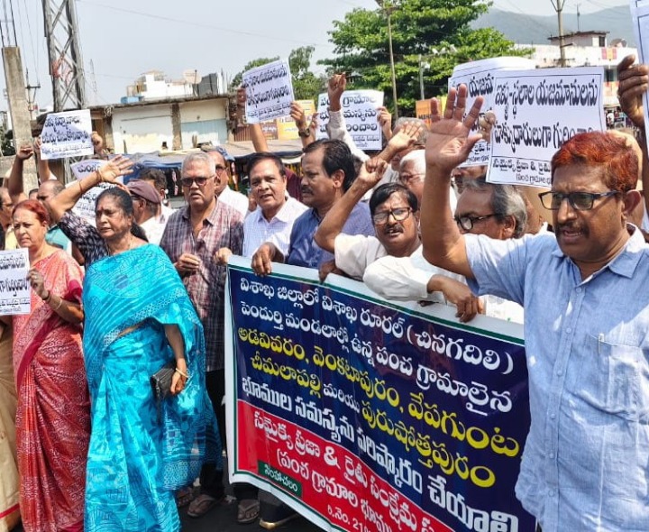 VSP: పంచగ్రామల భూ సమస్యపై శనివారం సింహాచలం జంక్షన్లో రాస్తారోకో నిర్వహించారు. సమైక్య ప్రజా రైతు సంక్షేమ సంఘం ఆధ్వర్యంలో జరిగిన ఈ నిరసనలో నేత టీ.వీ కృష్ణంరాజు మాట్లాడుతూ.. ప్రతి ప్రభుత్వం హామీలు ఇచ్చినా సమస్యను పరిష్కరించడంలో విఫలమైందని విమర్శించారు. కార్పొరేషన్ ఎన్నికలలోపు సమస్య పరిష్కరించకపోతే 17 వార్డుల్లో గుణపాఠం చెబుతామన్నారు