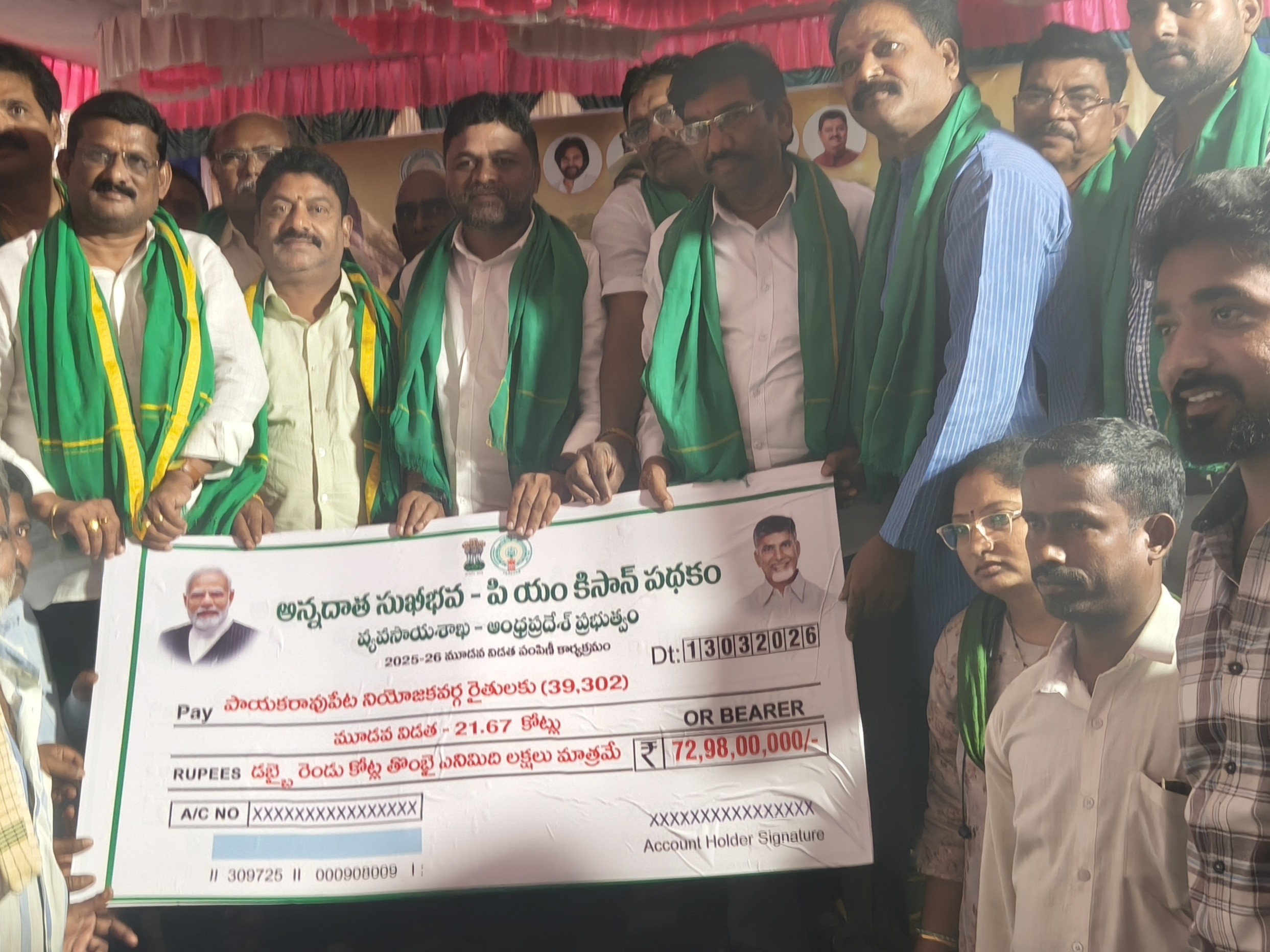 AKP: నర్సీపట్నం మండలం ధర్మసాగరంలో అన్నదాత సుఖీభవ – పీఎం కిసాన్ కార్యక్రమం ఘనంగా శుక్రవారం సాయంత్రం నిర్వహించారు. ప్రతి రైతు కుటుంబానికి ఏడాదికి రూ. 20,000 చొప్పున ఆర్థిక సాయం అందించే ఈ పథకం మూడవ విడత నిధుల పంపిణీని స్థానికంగా చేపట్టారు. ఈ కార్యక్రమానికి టీడీపీ పట్టణ అధ్యక్షులు, కౌన్సిలర్ చింతకాయల రాజేష్ ముఖ్య అతిథిగా హాజరయ్యారు.