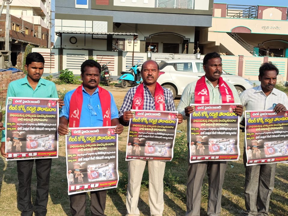 KMM: నాలుగు లేబర్ కోడ్ల రద్దుకై ఈనెల 16న జిల్లా కేంద్రాలలో, 23న సెంట్రల్ లేబర్ ఆఫీస్ హైదరాబాద్లో జరిగే మహా ధర్నాలను జయప్రదం చేయాలని IFTU జిల్లా అధ్యక్షులు షేక్ సుభహన్ పిలుపునిచ్చారు. ఈమేరకు గురువారం ఖమ్మం బల్లేపల్లిలో వాల్ పోస్టర్లను ఆవిష్కరించి మాట్లాడారు. కేంద్ర ప్రభుత్వం ఉన్నత వర్గాల కొమ్ముకాస్తూ అదానీ, అంబానీకి దేశ సంపద అప్పచెబుతుందన్నారు.