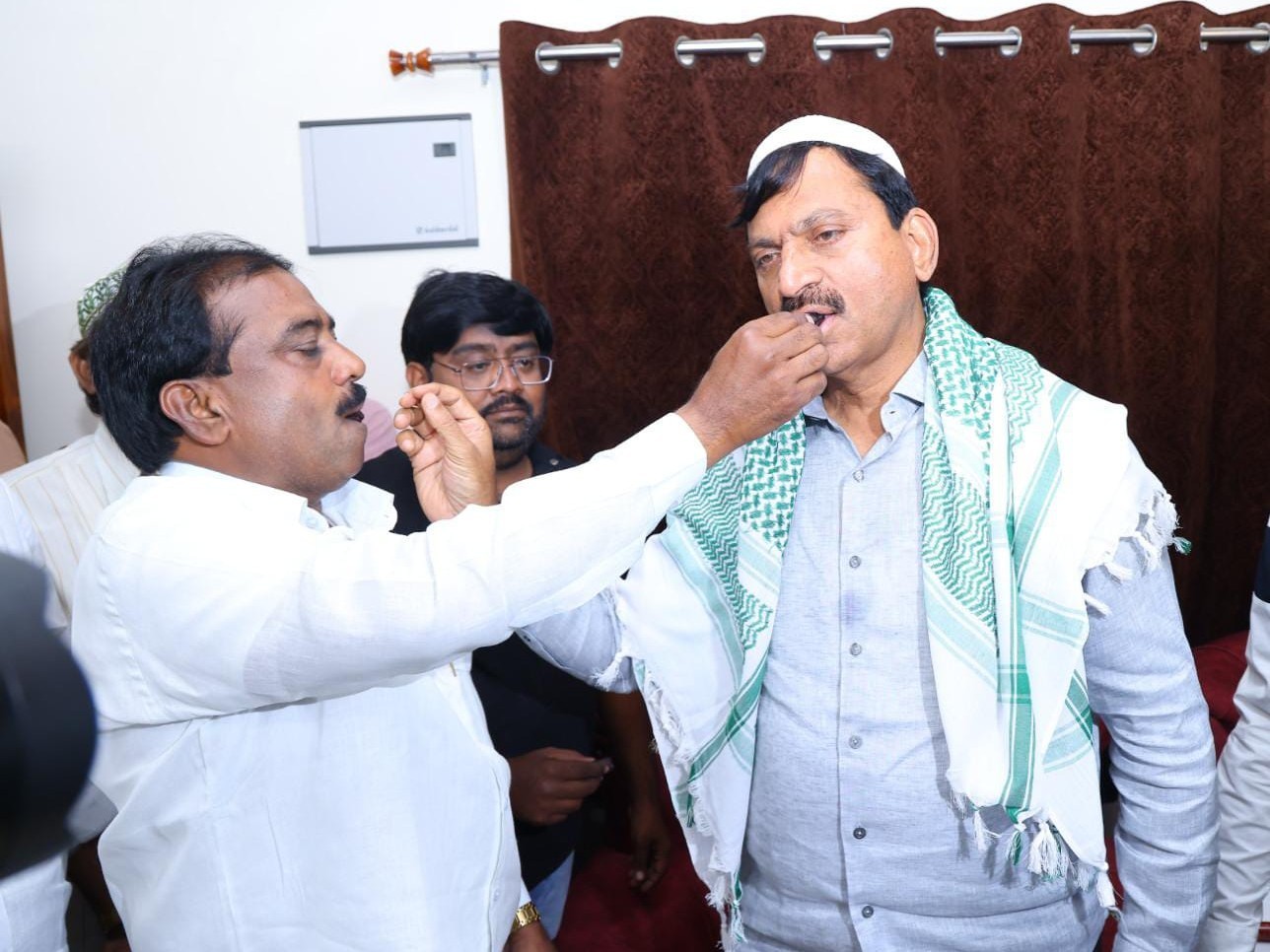 KMM: మత సామరస్యానికి, సోదరభావానికి ఇఫ్తార్ విందులు వేదికలని మంత్రి పొంగులేటి శ్రీనివాస రెడ్డి అన్నారు. ఆదివారం కూసుమంచి మండల కేంద్రంలోని శివాలయం రోడ్డులో కాంగ్రెస్ నాయకుడు మహమ్మద్ అలీ ఆధ్వర్యంలో ఏర్పాటు చేసిన ఇఫ్తార్ విందుకు ఆయన ముఖ్య అతిథిగా హాజరయ్యారు. ముస్లిం సోదరులతో కలిసి మంత్రి విందులో పాల్గొన్నారు. ఈ కార్యక్రమంలో ఆయన వెంట కార్యకర్తలు ఉన్నారు.