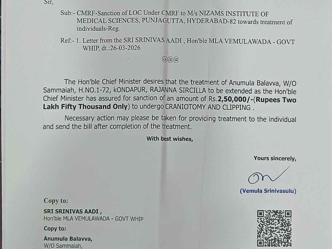 SRCL: కొనరావుపేట మండలం కొండాపూర్ గ్రామానికి చెందిన అనుముల బాలవ్వ అనారోగ్యంతో నిమ్స్లో చికిత్స పొందుతుంది. విషయం తెలుసుకున్న ప్రభుత్వ విప్ ఆది శ్రీనివాస్ ప్రత్యేక చికిత్స అందేలా ప్రభుత్వం నుండి రూ.2 లక్షల 50 వేల రూపాయలు వైద్య ఖర్చుల కోసం వెంటనే ఎల్వోసీ మంజూరు చేయించారు. ఈ మేరకు కుటుంబ సభ్యులు ఆది శ్రీనివాస్కు కృతజ్ఞతలు తెలిపారు.