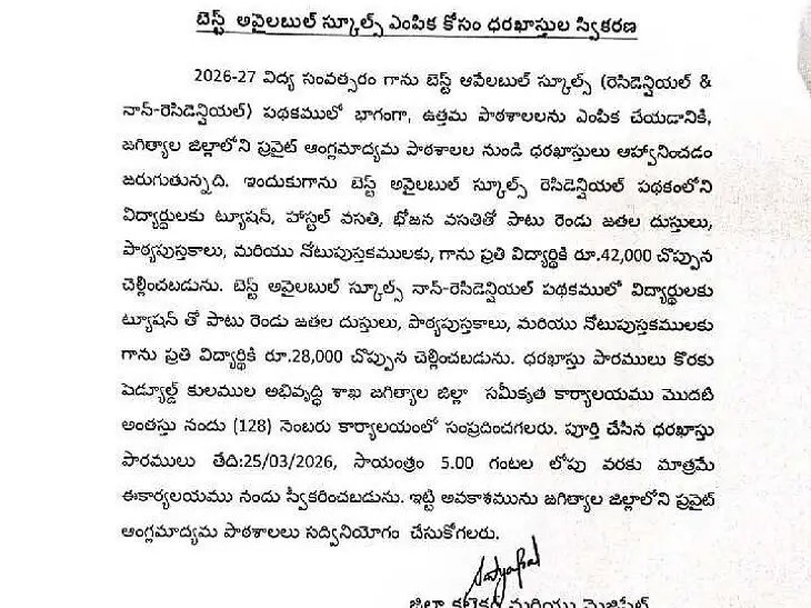 JGL: బెస్ట్ అవైలబుల్ స్కూల్స్ పథకంలో భాగంగా, 2026-27 విద్యా సంవత్సరానికి గాను ఉత్తమ పాఠశాలల ఎంపికకు, జిల్లాలోని ప్రైవేట్ పాఠశాలల నుంచి దరఖాస్తులను ఆహ్వానిస్తున్నట్లు, జిల్లా కలెక్టర్ సత్యప్రసాద్ తెలిపారు. రెసిడెన్షియల్, నాన్ రెసిడెన్షియల్ పథకాల కింద ఎంపికైన పాఠశాలల విద్యార్థులకు అన్ని సౌకర్యాలు ఉంటాయని, మార్చి 25 లోపు దరఖాస్తులు చేసుకోవాలన్నారు.