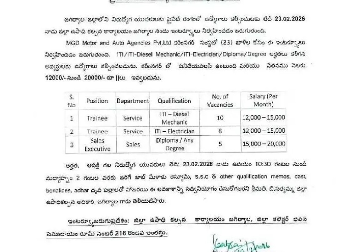 JGL: జిల్లాలోని నిరుద్యోగ యువతకు ప్రైవేట్ రంగంలో ఉద్యోగాలు కల్పించేందుకు ఈ నెల 23న ఉపాధి కల్పన కార్యాలయంలో ఇంటర్వ్యూలు నిర్వహిస్తున్నట్లు ఉపాధి కల్పనాధికారి తెలిపారు. ఎంజీబీ మోటార్, ఆటో ఏజెన్సీస్ కరీంనగర్ సంస్థలో ఐటీఐ, ఐటీఐ-డీజిల్ మెకానిక్, డిప్లొమా, డిగ్రీ అర్హతలు కలిగిన అభ్యర్థులకు ఉద్యోగాలు కల్పించనున్నట్లు, ఎంపికైన వారు కరీంనగర్లో పనిచేయాల్సి ఉంటుందని వెల్లడించారు.