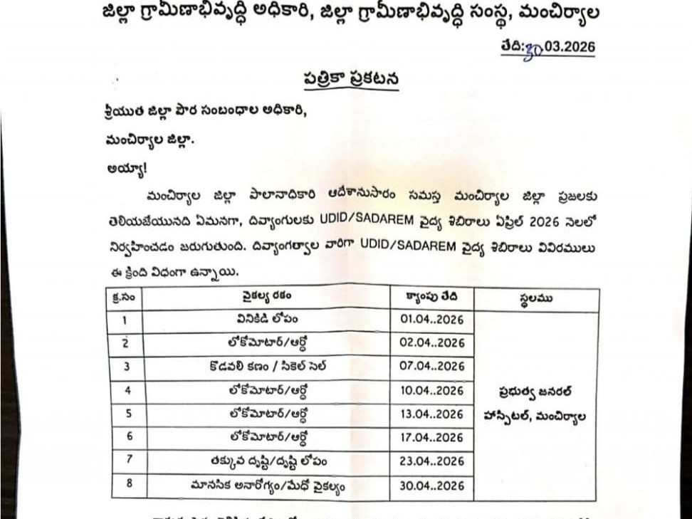 మంచిర్యాల జిల్లాలోని దివ్యాంగులకు ఏప్రిల్ నెలలో సదరం వైద్య శిబిరాలు నిర్వహించనున్నట్లు DRDO కిషన్ సోమవారం తెలిపారు. గతంలో మార్చి 26 వరకు నమోదు చేసుకున్న అభ్యర్థులు సంబంధిత పత్రాలతో జిల్లా ప్రభుత్వ ఆసుపత్రిలో హాజరు కావాలని సూచించారు. సంబంధిత తేదీలలో క్యాంపునకు హాజరు అగుటకు సంబంధిత అభ్యర్థి సెల్ ఫోన్ ద్వారా సమాచారం అందించనున్నట్లు తెలిపారు.