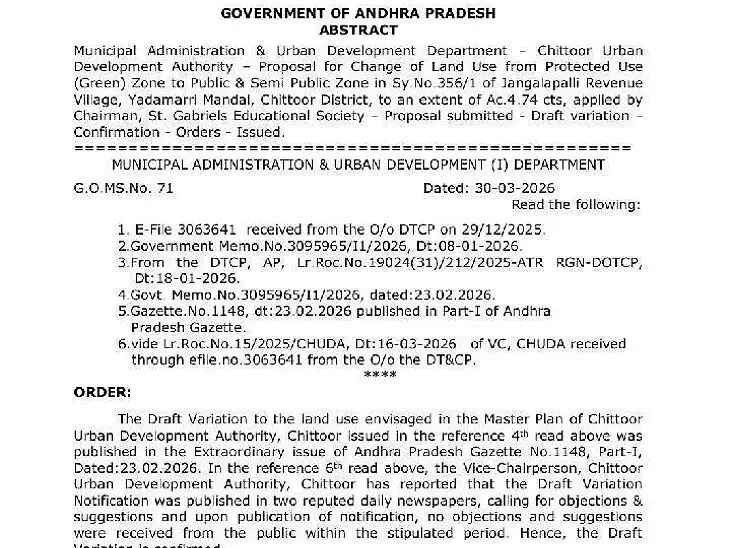CTR: జిల్లా యాదమరి మండలం జంగాలపల్లిలోని 4.74 ఎకరాల భూమి వినియోగాన్ని మార్చుతూ ప్రభుత్వం ఉత్తర్వులు జారీ చేసింది. గ్రీన్ జోన్గా ఉన్న ఈ భూమిని పబ్లిక్ & సెమీ పబ్లిక్ జోన్గా మార్చేందుకు అనుమతి ఇచ్చింది. గాబ్రియెల్ ఎడ్యుకేషనల్ సొసైటీ అభ్యర్థన మేరకు ఈ నిర్ణయం తీసుకుంది. ప్రజల నుంచి ఎలాంటి అభ్యంతరాలు రాకపోవడంతో ఈ మార్పును ఖరారు చేసింది.