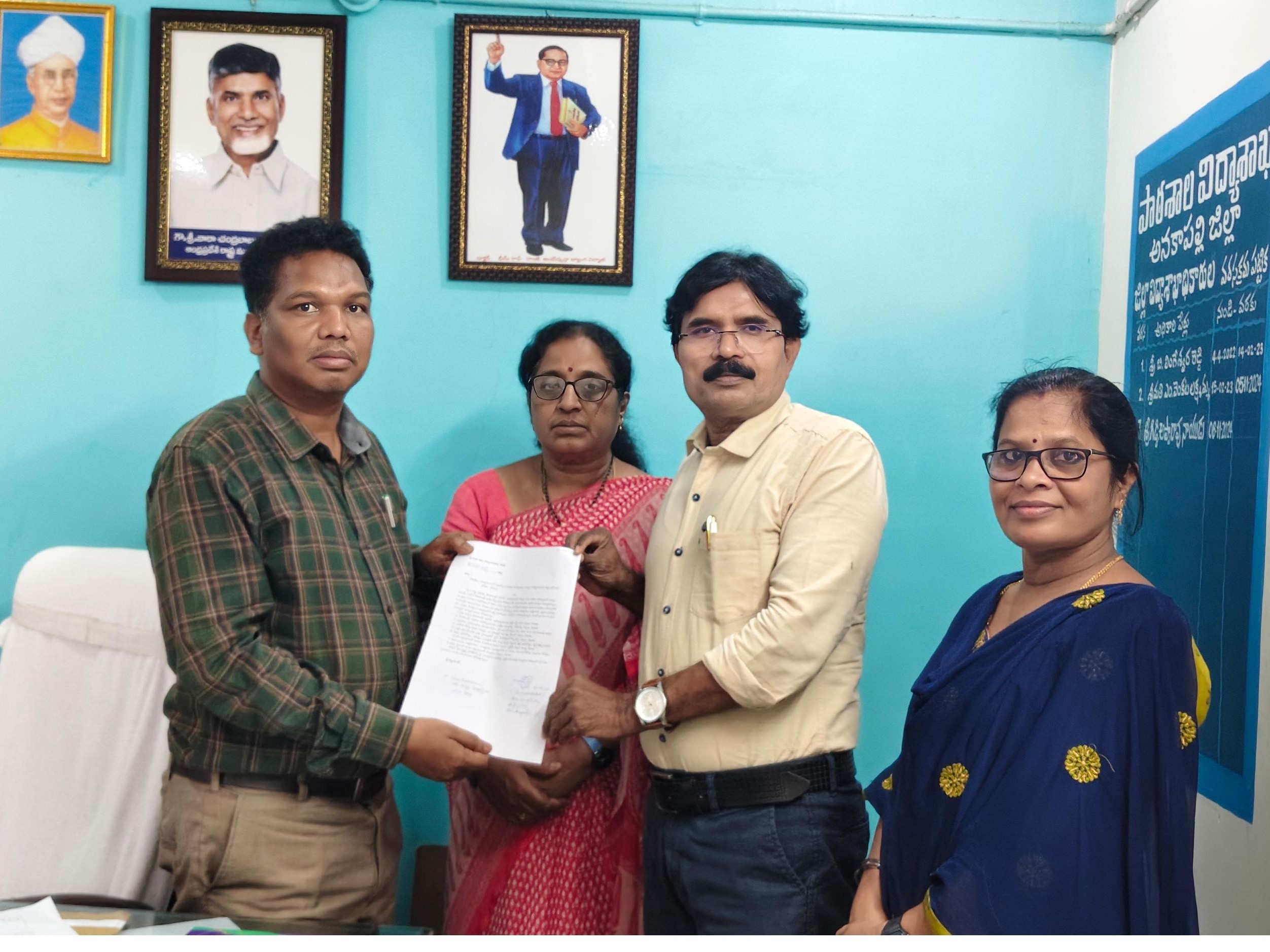 AKP: మహిళ ఉపాధ్యాయుల సమస్యలు పరిష్కరించాలని యూటీఎఫ్ ప్రతినిధులు విజ్ఞప్తి చేశారు. ఉన్నత పాఠశాలల్లో మహిళలకు ప్రత్యేక స్టాప్ రూములు, టాయిలెట్స్, వాష్ రూమ్స్ ఏర్పాటు చేయాలని యూటీఎఫ్ జిల్లా అధ్యక్షురాలు వి. శ్రీలక్ష్మి, ప్రధాన కార్యదర్శి గొంది చిన్నబ్బాయి కోరారు. ఈ మేరకు డీఈఓ అప్పారావు నాయుడికి మంగళవారం వినతి పత్రం అందజేశారు.